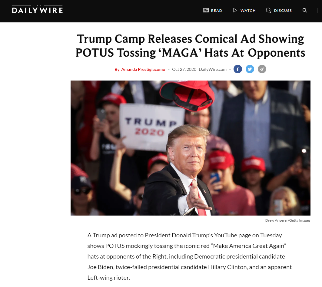 A Trump ad posted to President Donald Trump’s YouTube page on Tuesday shows POTUS mockingly tossing the iconic red “Make America Great Again” hats at opponents of the Right, including Democratic presidential candidate Joe Biden, twice-failed presidential candidate Hillary Clinton, and an...www.dailywire.com