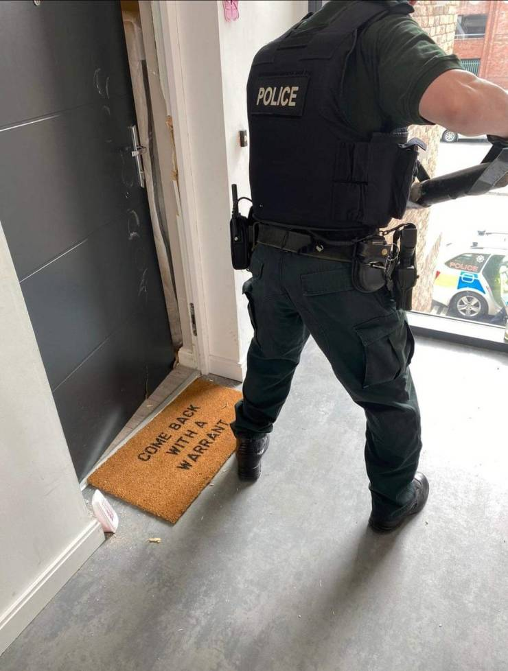 Cop car has Battenburg markings, so it is foreign police. The dents on the door, indicate he had to work to get that open. Shit, he split the bottom of the door.