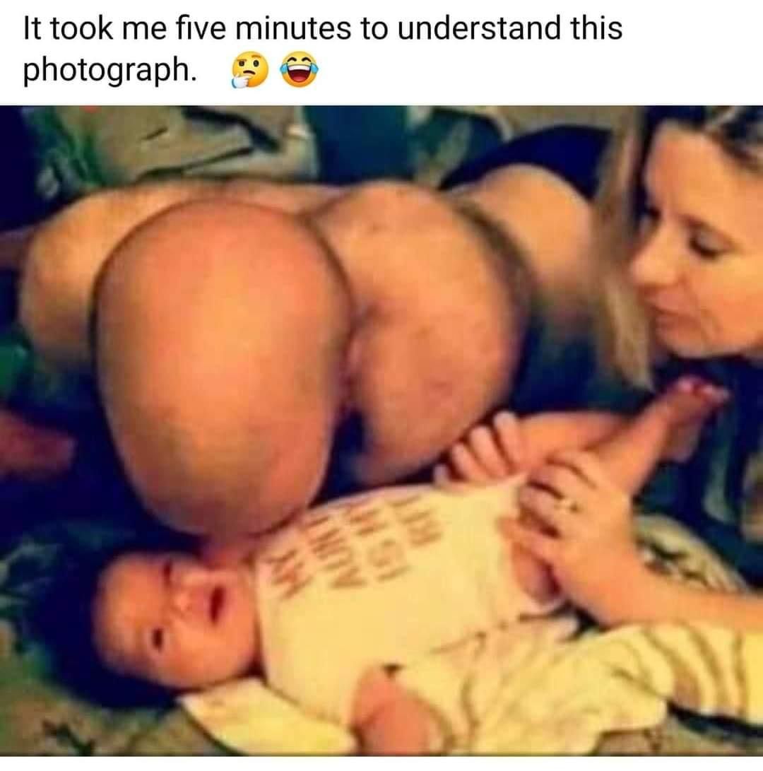 I never would have got thatBald and shirtless dude is kissing his baby next to the mother. It's his head and shoulders are what you are looking at.