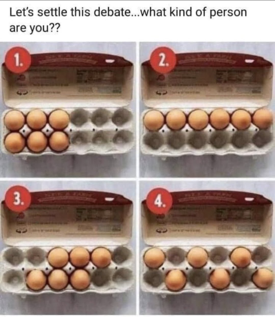 I was just guessing. Kinda like those tests were you color in the circle. I actually don't know cuz we don't put eggs in a carton in the fridge. Ours go from the chicken to a rack on the counter. It's been years since we've bought eggs and then they went from the carton to an egg carrier.What? It’s simple, you load them like 1 and put it in the fridge with the empty part first. When you take it back out and grab the carton, all the weight is already in your hand.