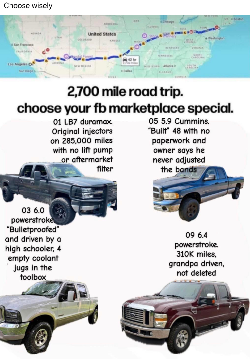 Thats the least bad option. You’re probably going to be finishing the road trip on a flat bed thoughI'm going with the Grandpa 6.4. It's made it this far. It's made it 310k, another 5-6 prolly won't kill it.