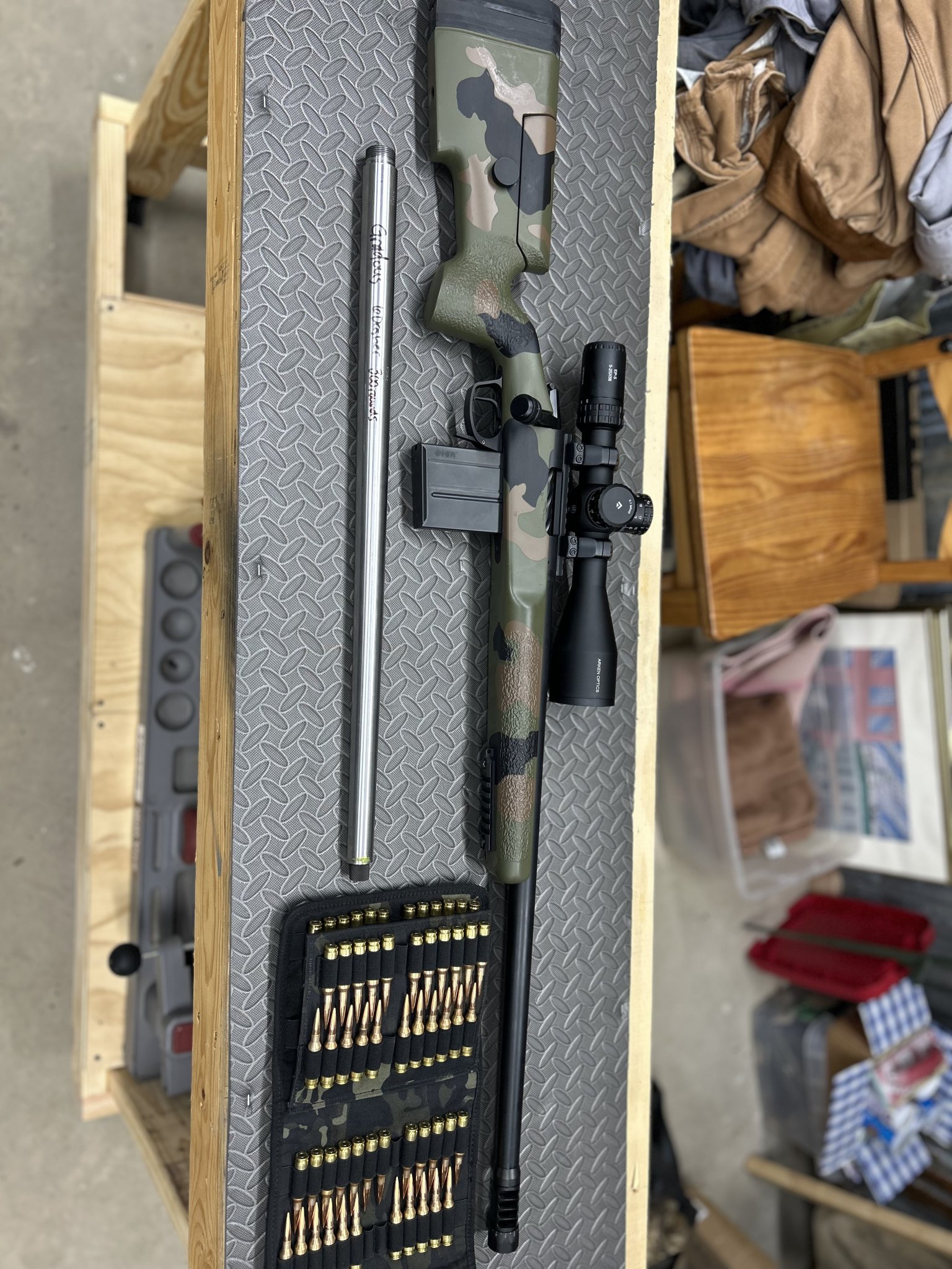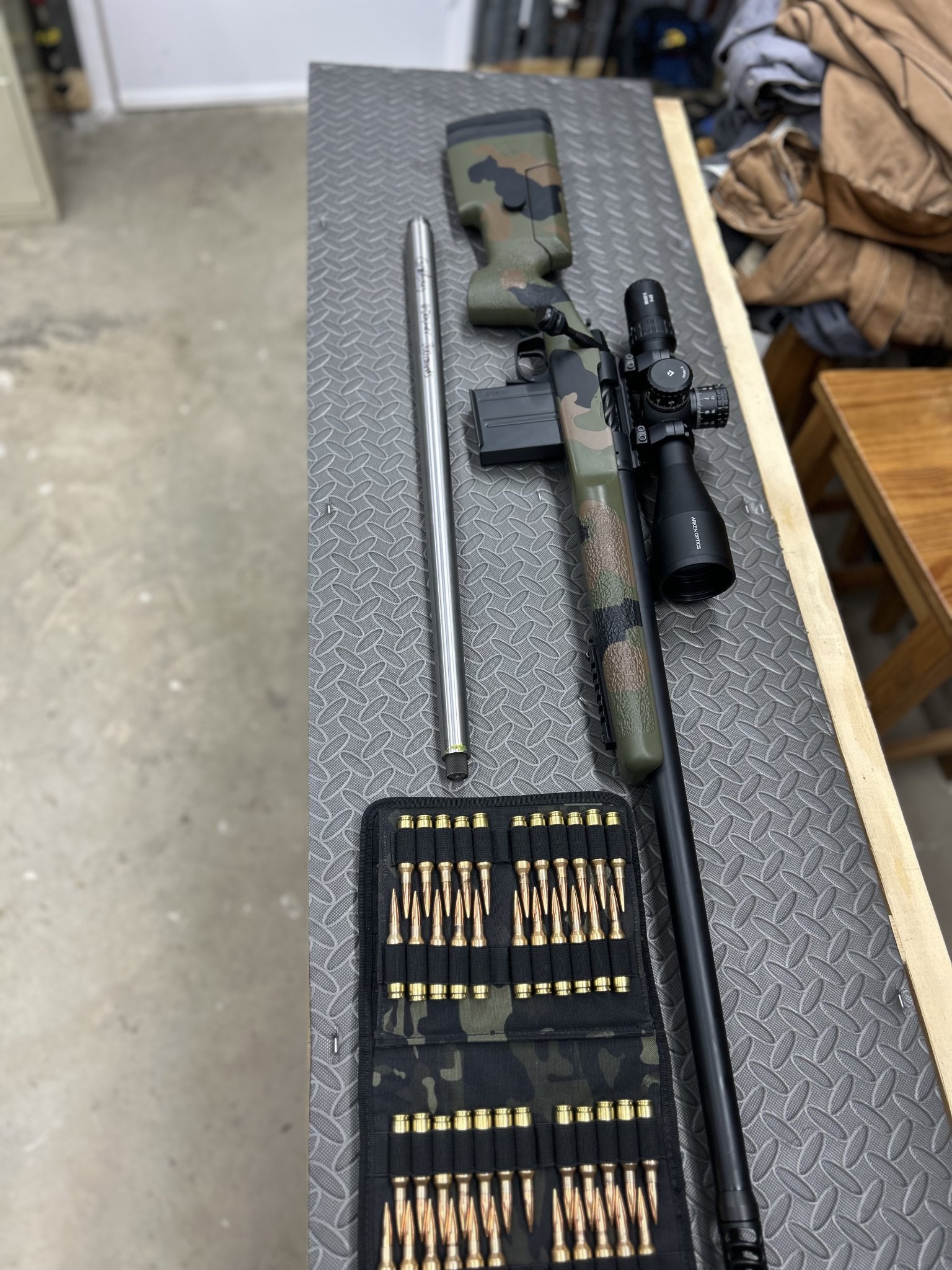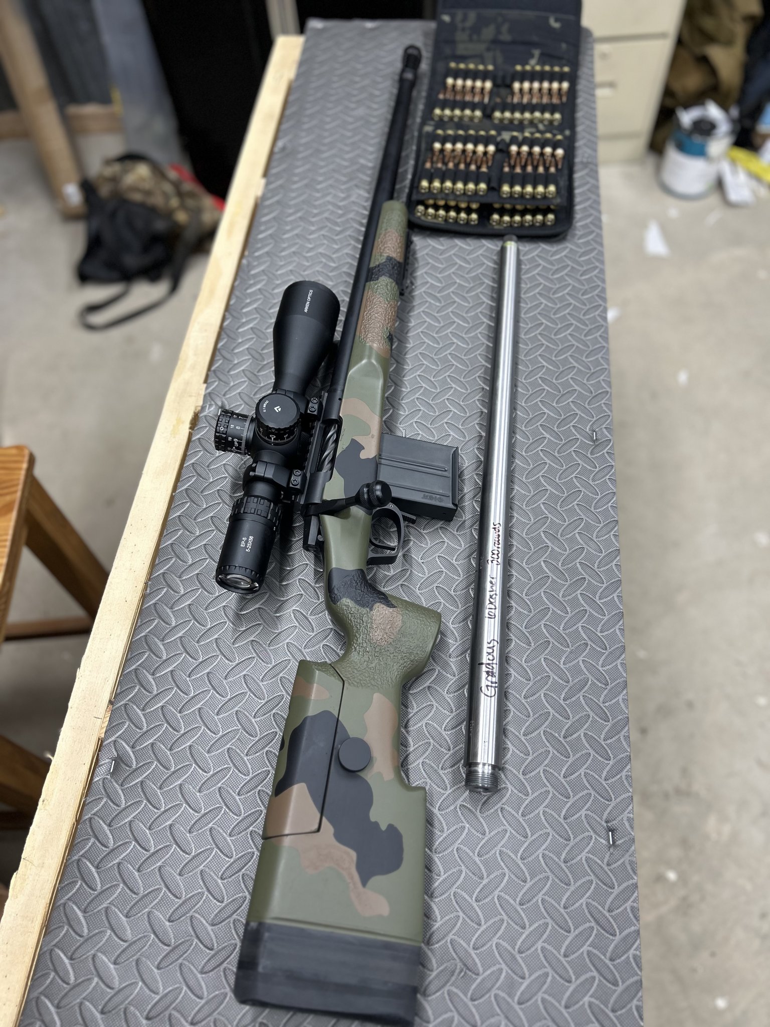MPA barreled action with 6.5 creedmoor and a spare graduous 6mm dasher barrel, Triggertech special, McMillan A5 adjustable with custom cerakote, I believe the DBM is a Hawkins. Approximately 250-300 rounds through the 6.5 barrel and 300 through the dasher. Pic shows cortina tuner brake but will put the stock MPA brake back on. Will include 90 rounds of 140gr Berger hybrid hand loads. Arken EP5 and rings not included in price but can be added if you want. I can ship wherever or face to face is fine with me too im in the dfw area. Asking $2300 OBO