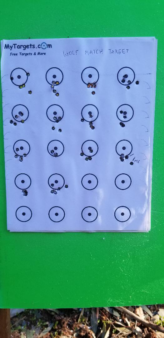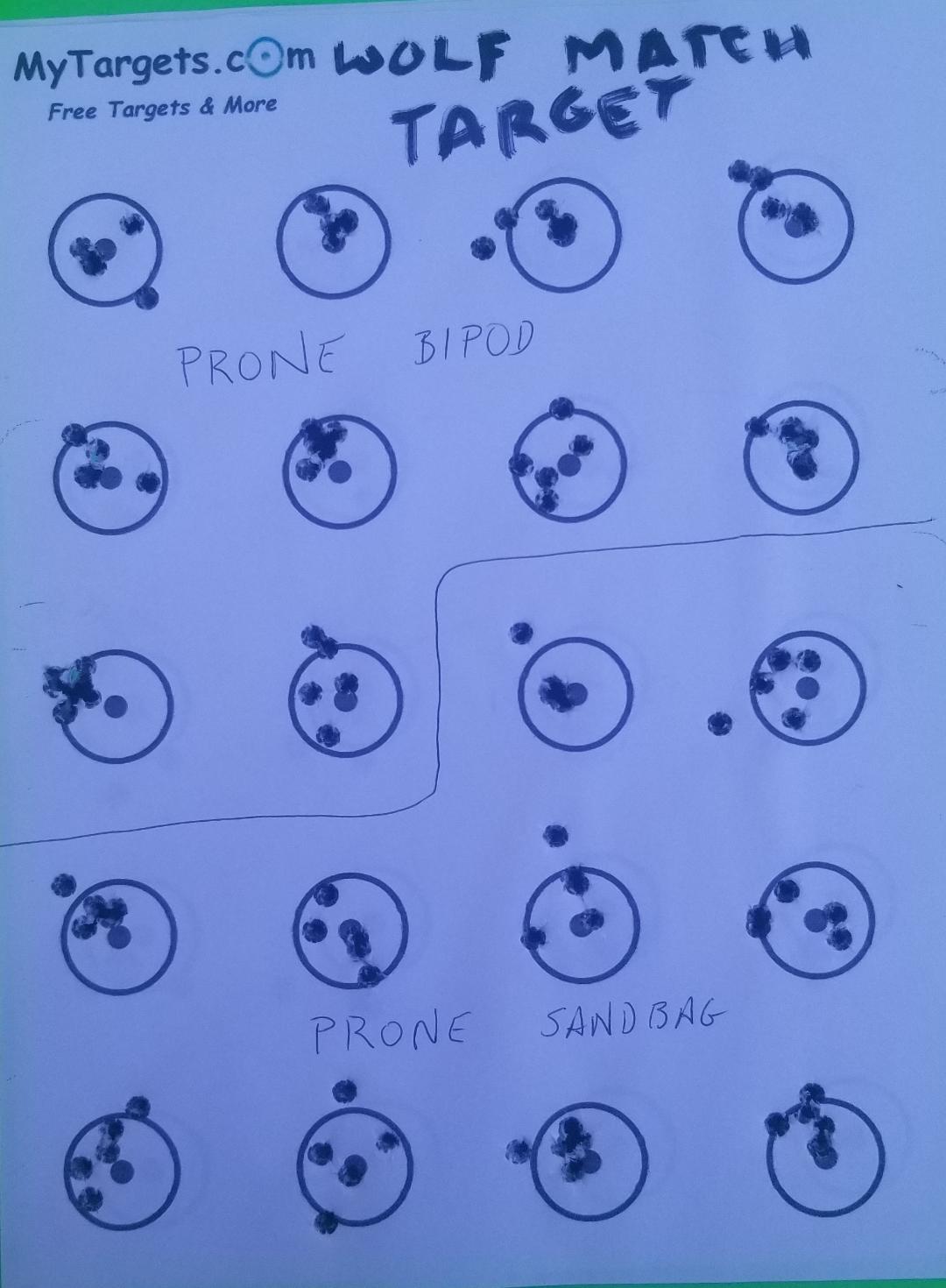 I'm working on finding that perfect ammo/position/contact combination, but this is a group I shot today. As a result of a reply on the prior thread by Seymour Fish, I tried to take out as many variables as possible. Barrel was cleaned by running a snake down the barrel, and I cleaned up the chamber with a bore brush. I then used Wolf Match Target in the prone position, first from the bipod (with the steel cleats inserted, not the rubber feet), and then off a sandbag. Prior to shooting the groups, I reset my zero, since the rifle had been taken apart to be retorqued.