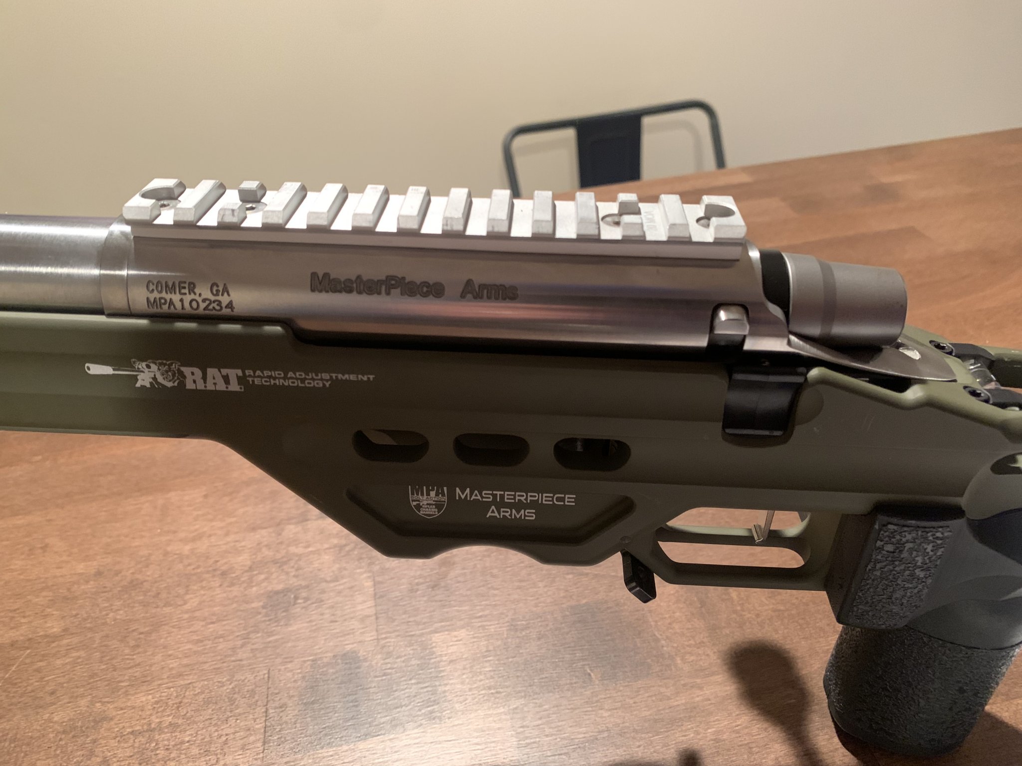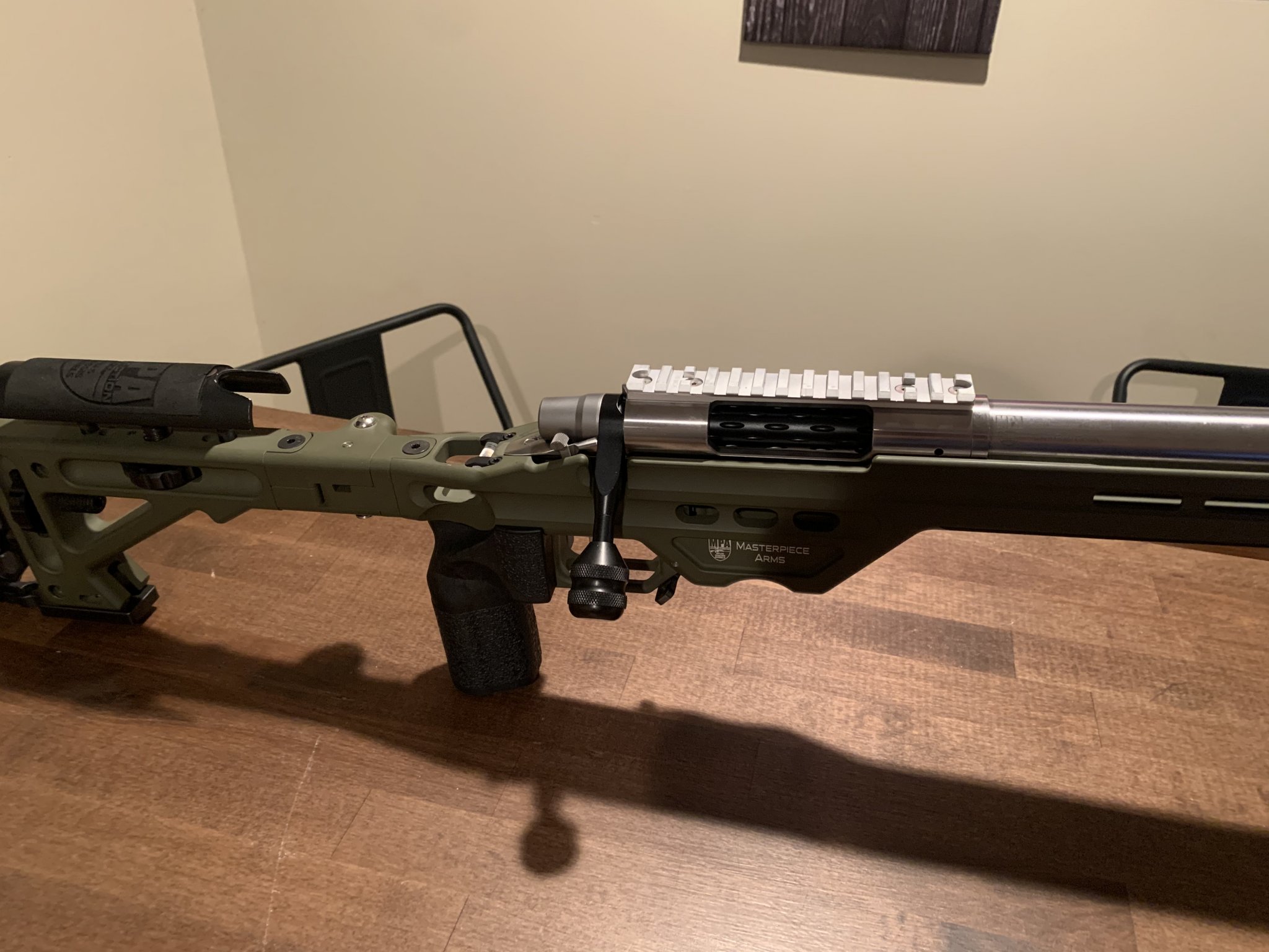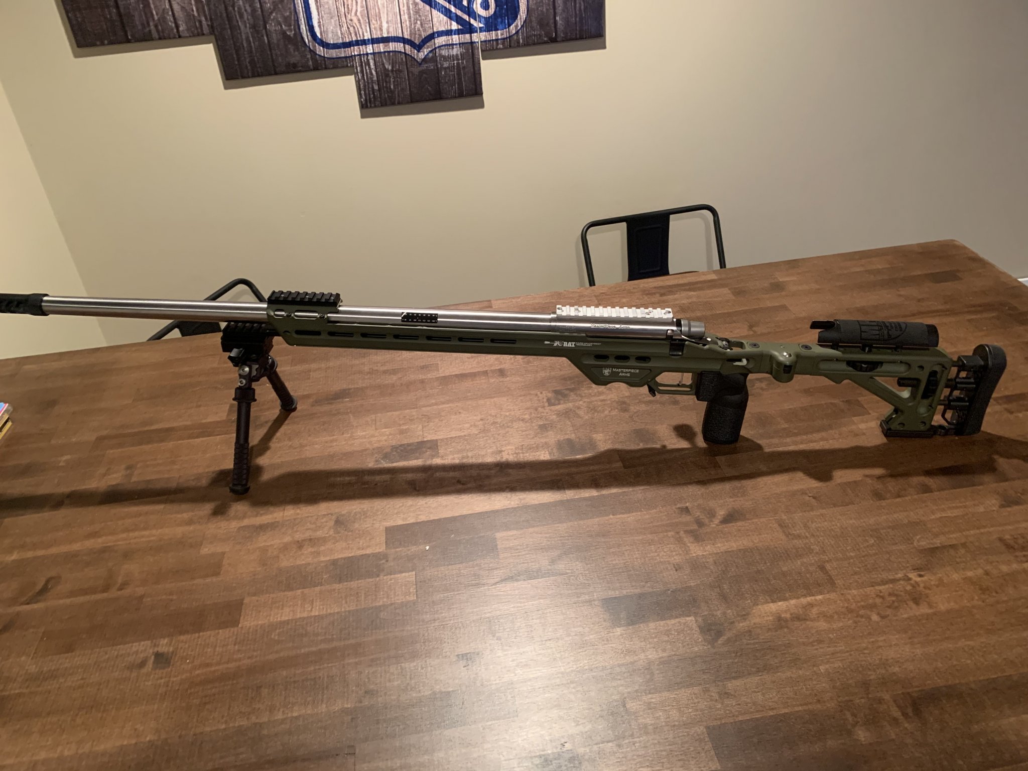 MPA barreled action (Curtis axiom branded MPA) with 26in barrel chambered in 6mm creedmoor. Sitting in MPA ESR OD green folding chassis. Has folding stock, bag rider, trigger tech special trigger, 20moa rail, hellfire brake, spigot mount and the bolt has been fluted and coated. Extremely smooth operation. Bipod not included