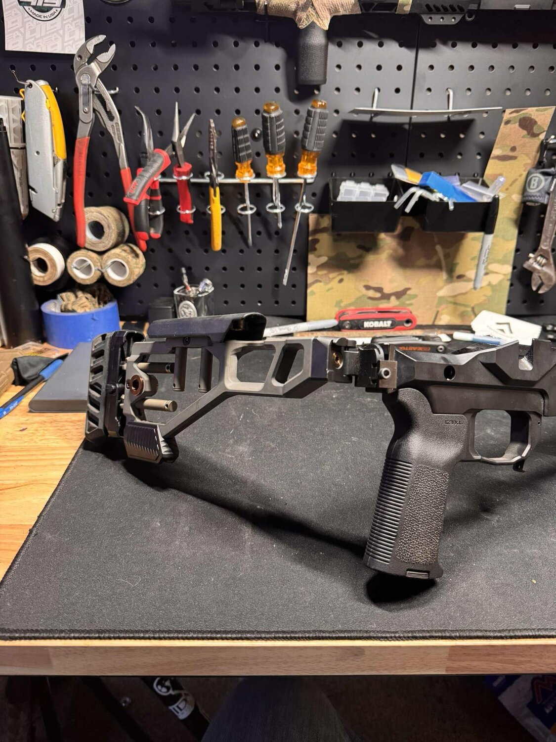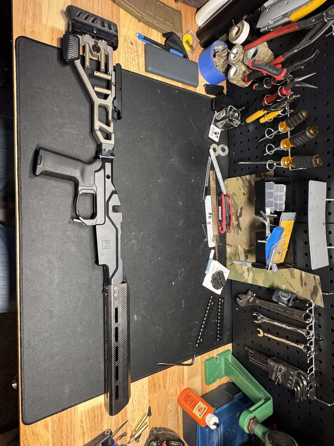 MPR short action chassis with the 14" handguard and a Q fix stock with the big butt pad and crutch added to it.