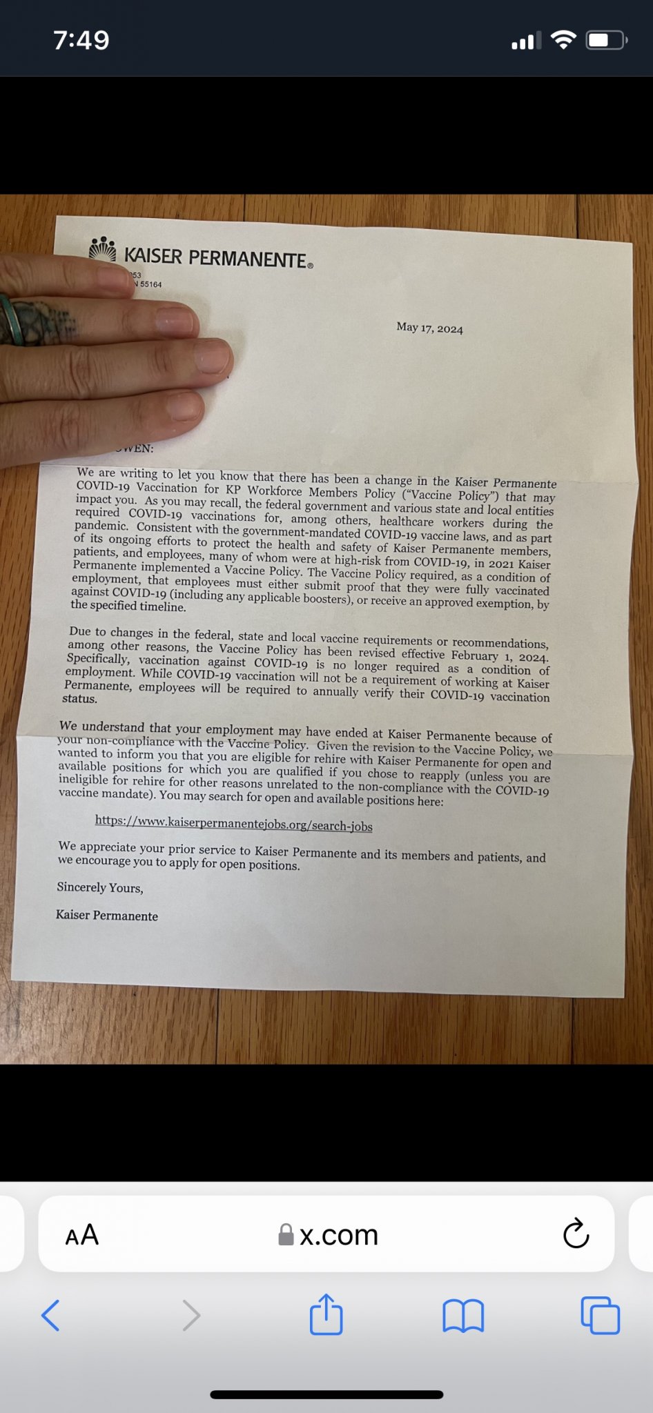 The companies begging for people they fired to come back is hilarious and shameful, that letter passing the buck to the government making the calls like they had nothing to do with those decisions is . Kaiser Permanente were 100% on the clot shot train, I remember the statements they were putting out, and their website is still full of all the bullshit. https://healthy.kaiserpermanente.or...-information/vaccine-learn/safe-and-effective