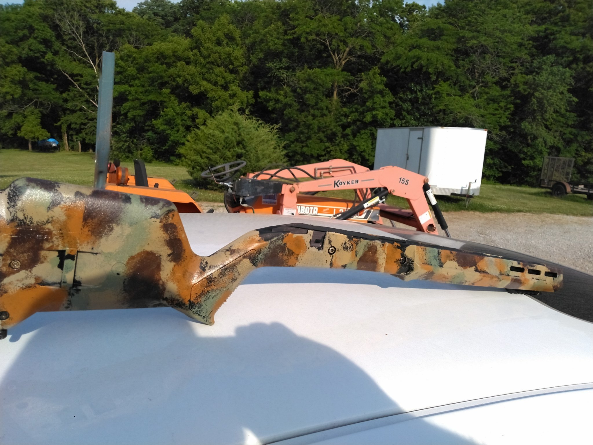 I took the plastics off and masked anything important. I then let my kids loose with a sponge and a palate of krylon. They had a great time and it kept my adult (read patterned and organized) brain from interfering with the overall concept behind camo in the first place.