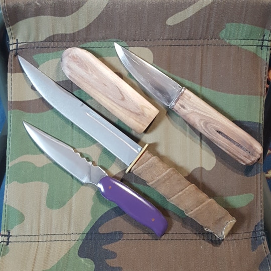 The purple handle was the first. Based on a tanto, take a few shape changes, work with it and practice hand working from a billet to a blade.