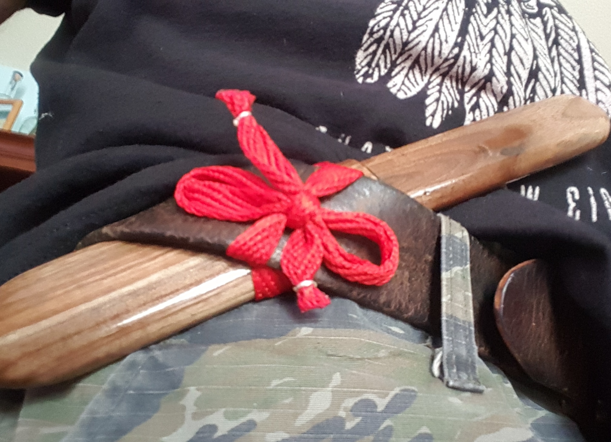 The old school tanto is based on a fourth or fifth gen blade, has a wooden handle covered by leather wrap and the pommel is a US Army mos badge backer from dress uniform collar. The three nails that hold that together were made from stuff I had laying around.