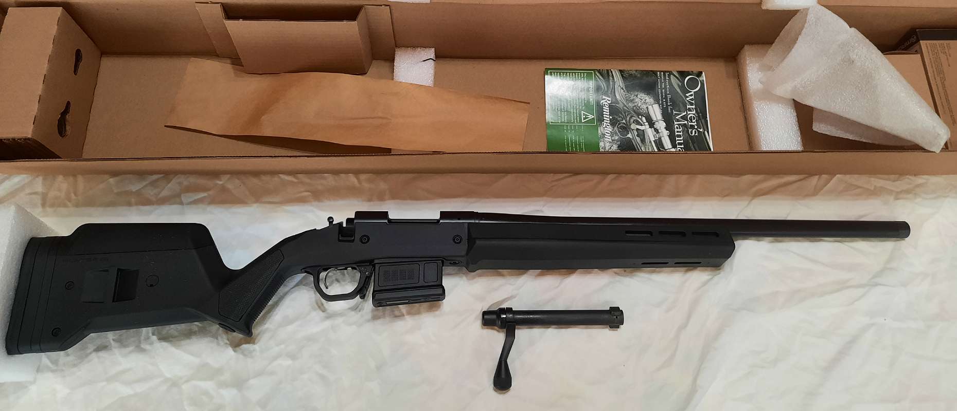 New In Box Remington 700 Magpul edition in .308 Win. with threaded 1:10 twist 5-R 22″ heavy barrel; action takes detachable magpul and other AICS pattern magazines (comes with one 5 rd mag); Black Cerakote finish; 35.5″ overall length. Thinning the herd and selling some guns I have never got around to shooting. If this gun shoots anything like the .308 twin to it that I have shot, it should be an absolute tack driver for a factory gun (getting close to 1/2 MOA from the other.308 I have shot). The Remington model or SKU is 84293 if you want to do a little more research on this one. Text me for additional photos or questions regarding this gun, and I will do my best to get back with you. Again, asking $895, which is about $200 below what I paid.