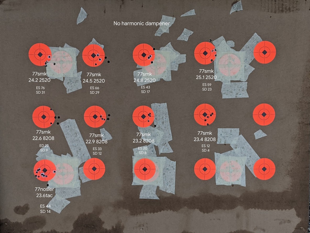 One additional variable, i removed a rubber harmonic dampener from the barrel, right behind the muzzle devise/suppressor where it grouped best, this time around. Having the dampener did seem to tighten the groups. Take a look and let me know what you think.