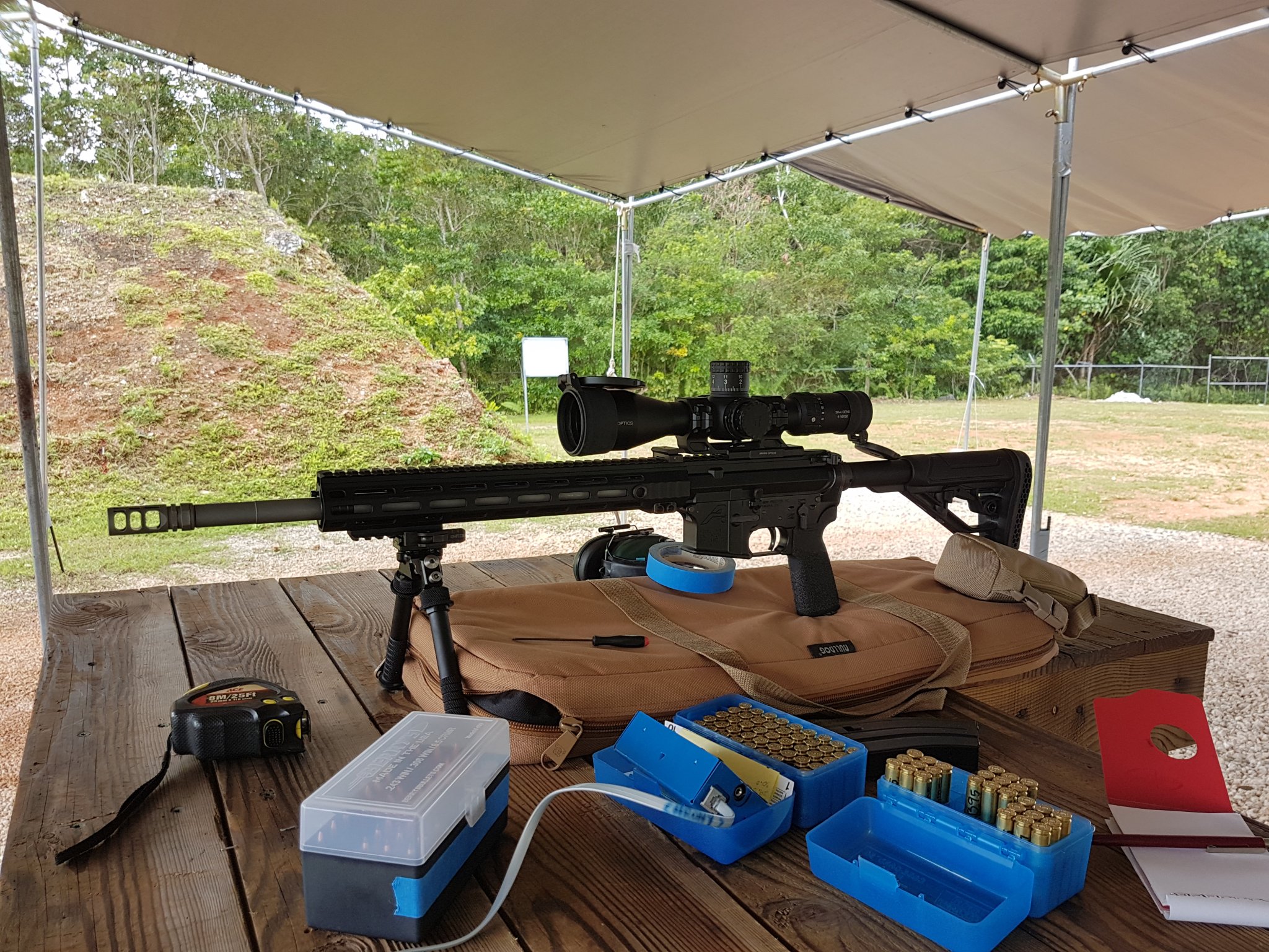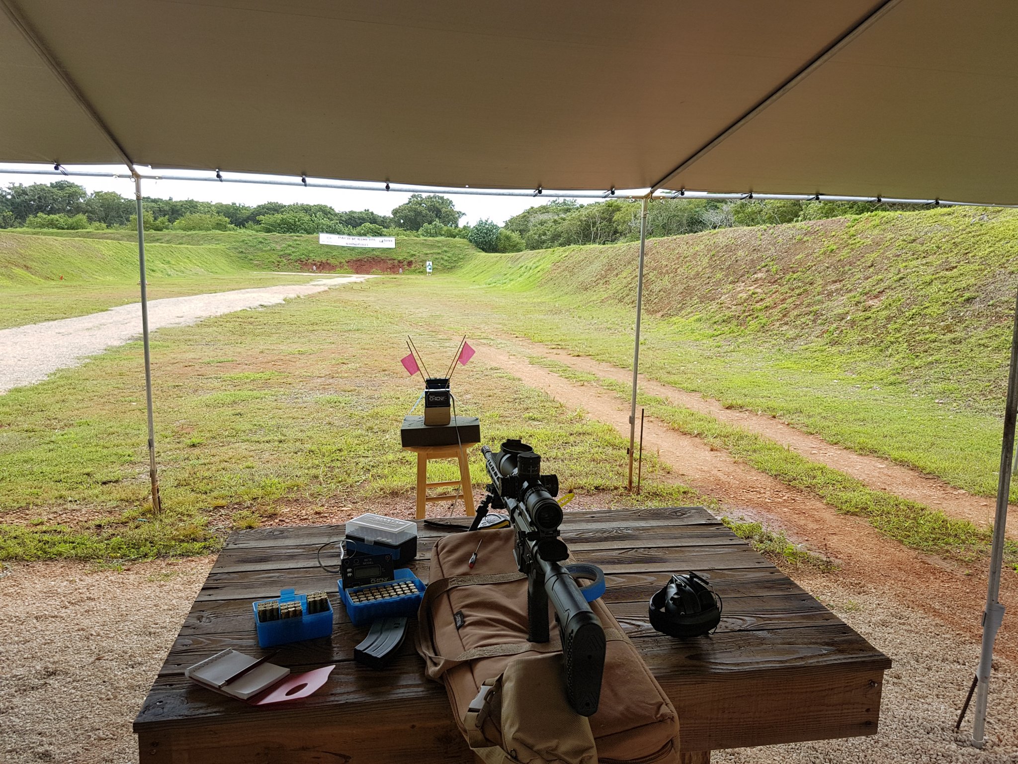 ...that particular group was the max Berger 95 VLD load and the 67th, 68th & 69th round of 113 rounds down a brand new BA 18" barrel. It was the 1st time out for the build. I have not been able to get any factory ammo so I went straight to handloads. I only use factory ammo to validate a build and establish baseline data. If you scroll back in this thread my results from that day are posted. The focus was testing powder charges for pressure, not accuracy, ensuring the bullet passes over the optical sensors of my old chrony, having an aiming point down range helps to keep that bullet as centered as possible over the sensors. Pic I took waiting for the rain to pass, had to bring chrony under the canopy.