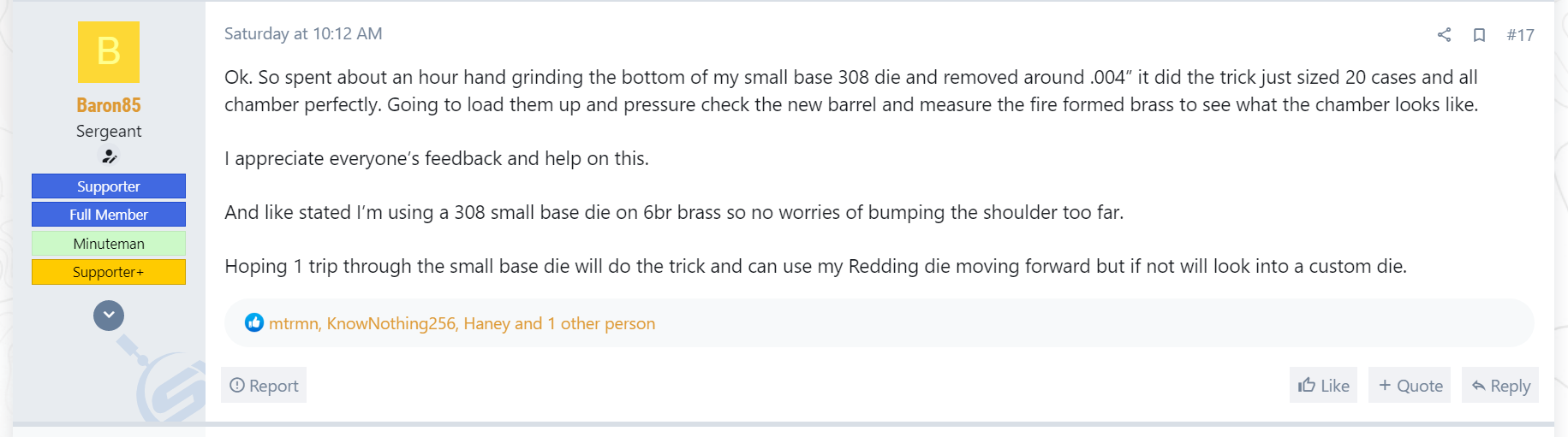 And again most people here that are commenting about me being the only person that knows this are probably the ones that have never heard of or seen what I am talking about. That's not making assumptions. Being on many, many gun forums over the last 27 years has showed me most people do not know this. How do I know this? Everyone was telling him to file the top of the shell holder or file off the bottom of the die. Not a single person asked if there was a space between the die and shell holder when the case is fully ran into the die. Taking material off of the shell holder or die would not help this.