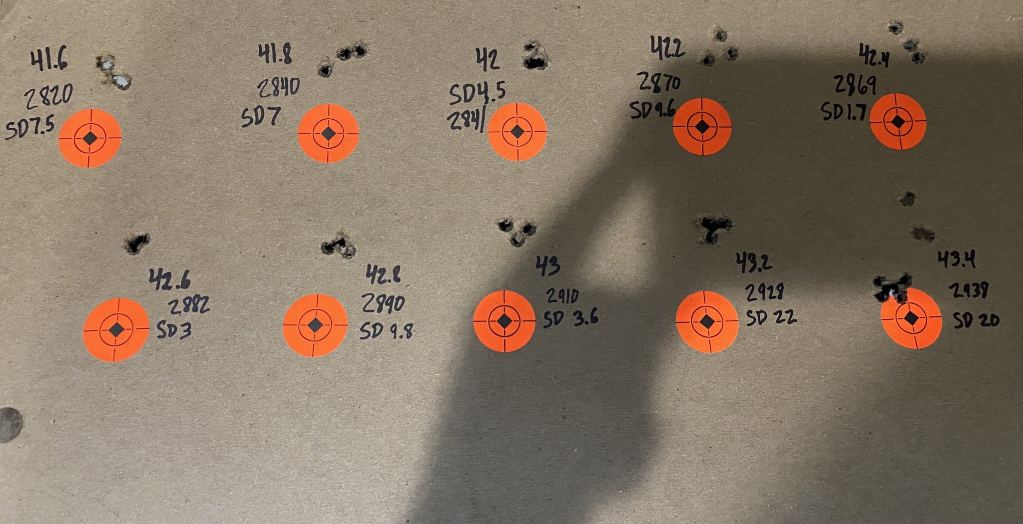 @dntworry I would just shoot the 42 load. I don't buy into the graphing method. Too many variables, esp if your load process is not 100% spot on with everything you do. I have gone to shooting until I see signs of pressure then backing off 2.5 grains and shooting in .2 grain increases for 1 grain. I just did 4 rifles, they all landed in that area. It is a lot faster method. Bryan Litz told me about it at Shot Show this year. I reviewed previous loads for multiple rifles, and they landed in that area too. I am running these at .025, it is where I do all my load development. If I have to do a seating test, I will start at .010 and go to .035 in .005 increments. I load a bunch at .010 and use a Lee hand seater at the range. I rarely have to adjust seating though. Your 42 group looks nice with a good ES/SD. I would run it. Shoot it at distance, get more chrono data as you go too, but that looks like the load.