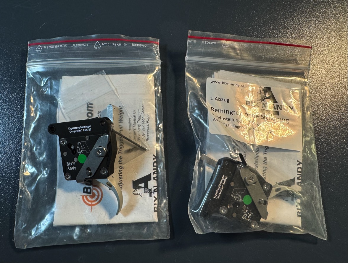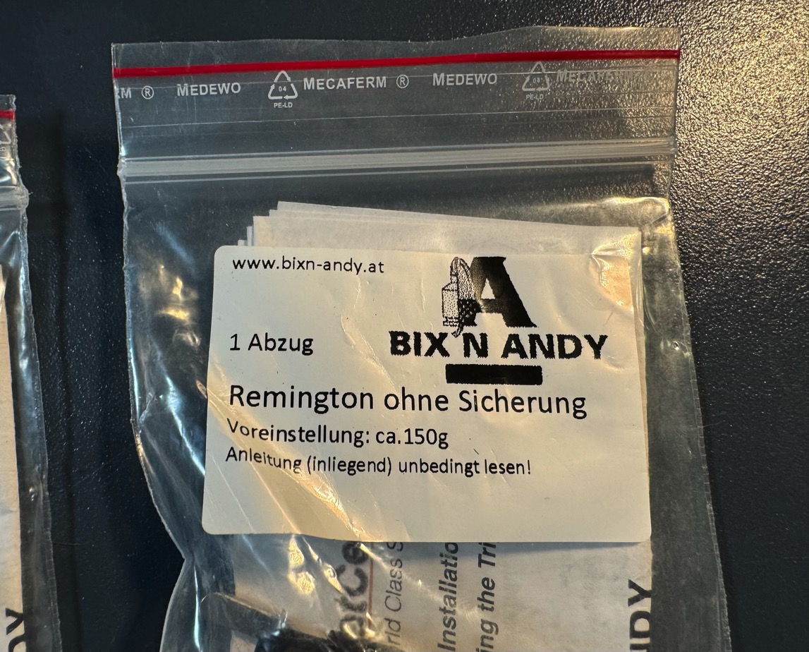 Two new Bix'n Andy Competition Triggers Remington 700 Single Stage, Top Right Safety, Bolt Release—$275 each or $500 for both shipped. The Bix’n Andy Competition Trigger Remington uses a unique ball bearing mechanism that allows for trigger pull weight adjustments 1 ounce (30 grams) to 25 ounces (700 grams). The consistency of the Bix’N Andy trigger break is within 0.03 ounce!