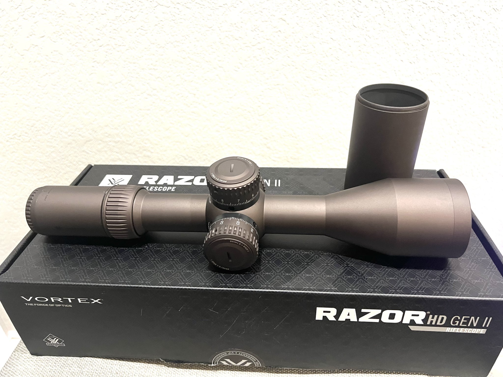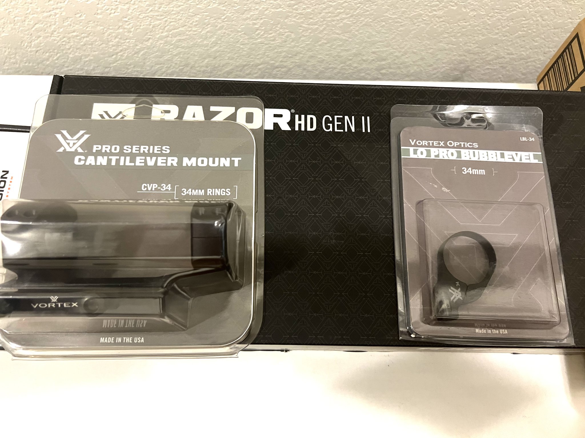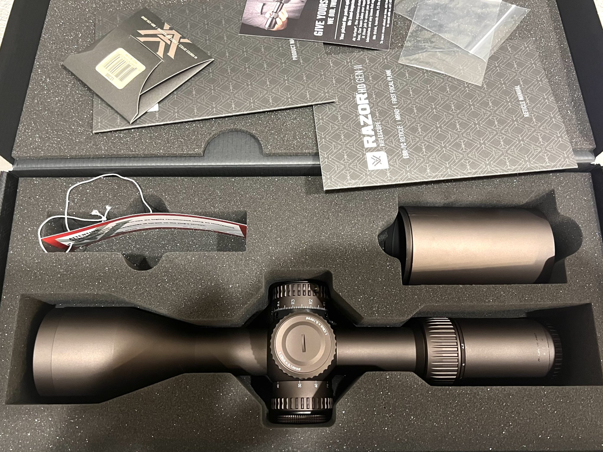 New in box Gen 2 Razor, 34mm vortex pro series cantilever mount and bubble level. Handled a bit to look through the glass, but never used. Comes with box and manuals. Has one tiny mark on it circled in photo. Hardly noticeable, was there already when I opened the box.