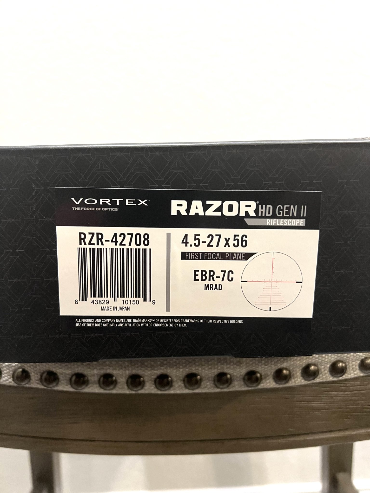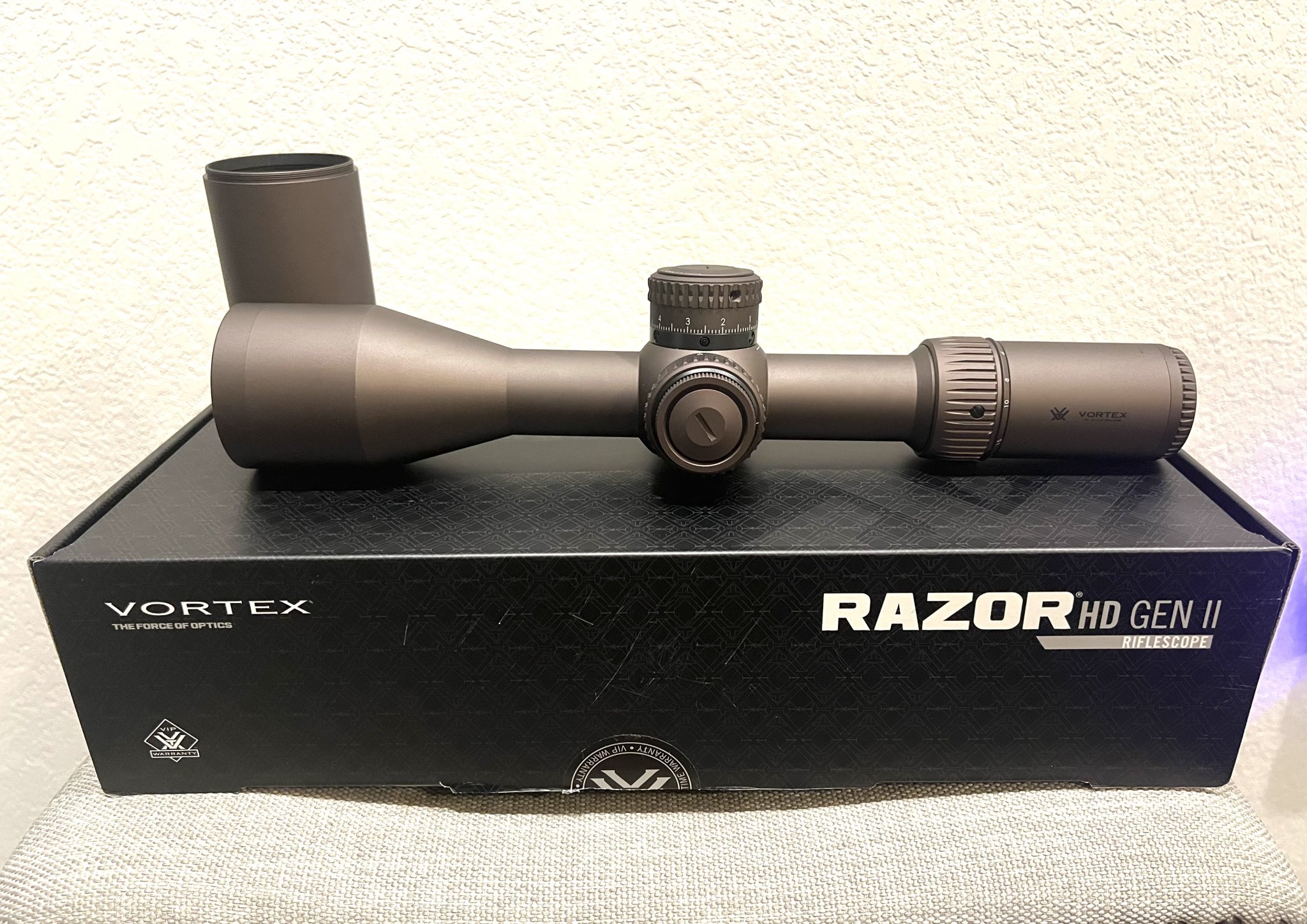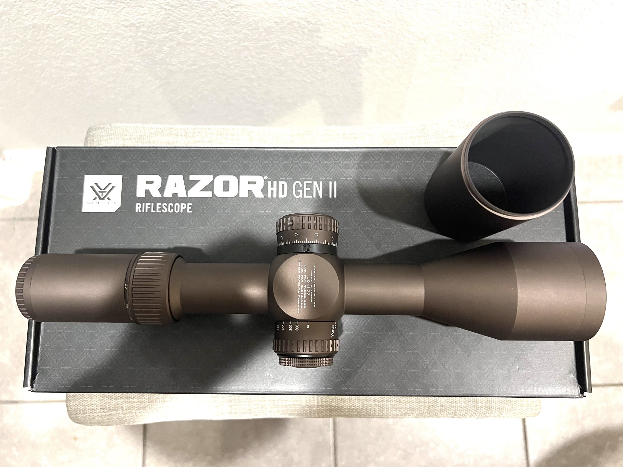 New in box Gen 2 Razor, 34mm vortex pro series cantilever mount and bubble level. Handled a bit to look through the glass, but never used. Comes with box and manuals. Has one tiny mark on it circled in photo. Hardly noticeable, was there already when I opened the box.