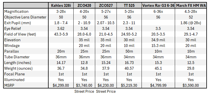 Pulled this together to see how it stacks up to other Alpha scopes. Couldn't find the total windage and elevation adjustments for the Kahles but aside from the exit pupil the specs fit right in with the others. And the exit pupil is about the same as the March (both on 28x). FOV blows them all out of the water. Almost identical FOV on 28x as the ZCO 420 @ 20x. Field of view on the NF NX8 2.5-20x is 41.8' on 2.5x so the Kahles beats that. I know FOV isn't the end all be all but it has other comparable specs.