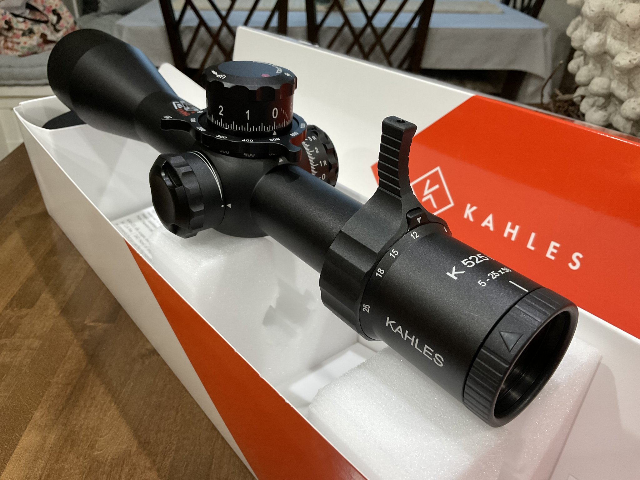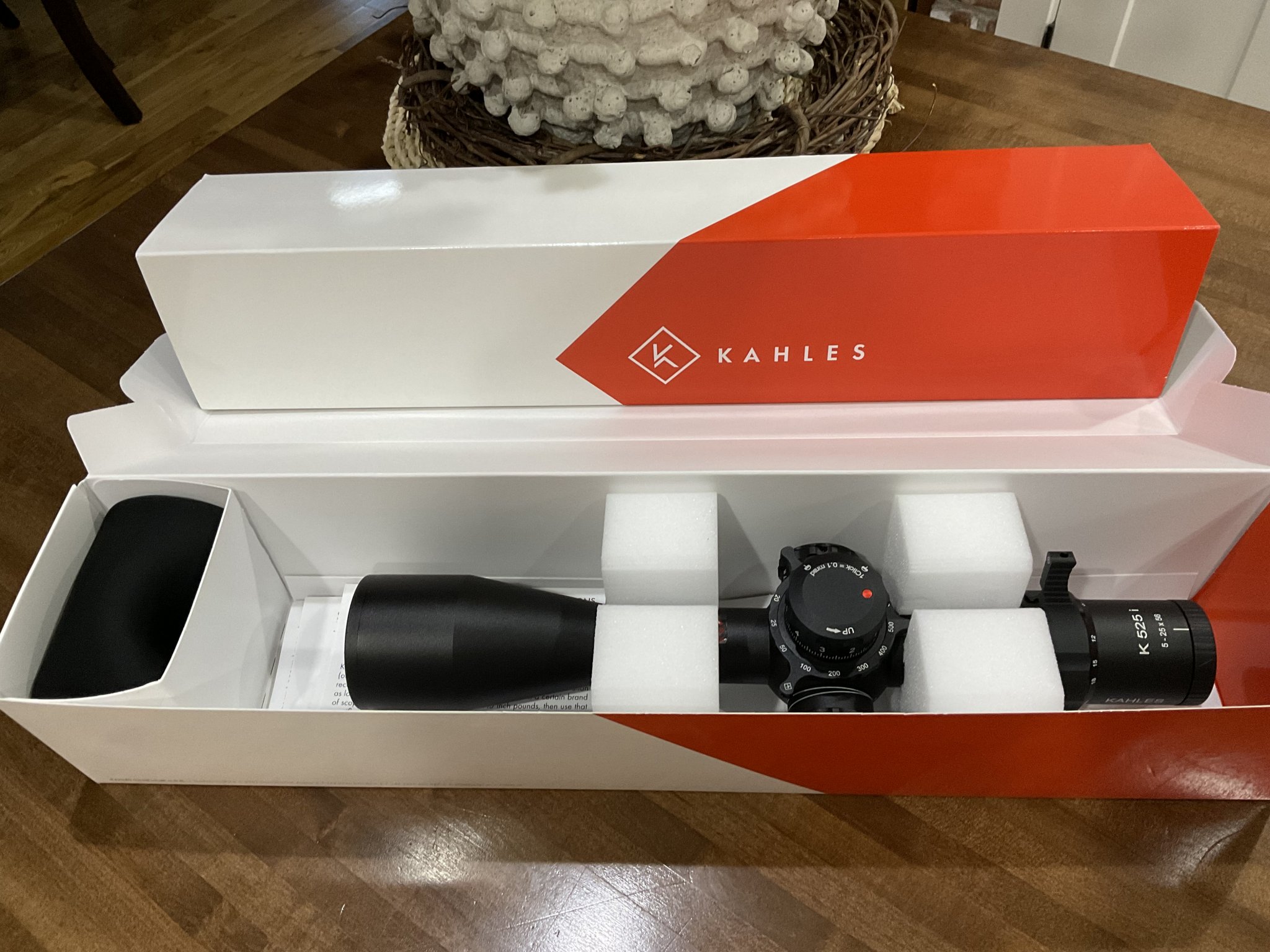 SOLD New Kahles DLR K525i RSW and SKMR4 reticle. I bought the scope a couple of months ago from Sport Optics to use on a new rifle build, but ended up changing my mind and decided to go with a lower magnification scope for hunting. The scope was only taken out of the box to test fit on the new rifle and to take these pictures. The scope is in 100% brand new condition with absolutely no flaws and comes with all of the included Kahles accessories, factory throw lever, factory neoprene scope cover, original box and paperwork. I will also include a new set of Kahles Tenebraex scope caps. You are buying a brand new Kahles DLR. Price includes shipping to the lower 48. I will only sell to verified established members. I prefer PayPal F&F for the form of payment.