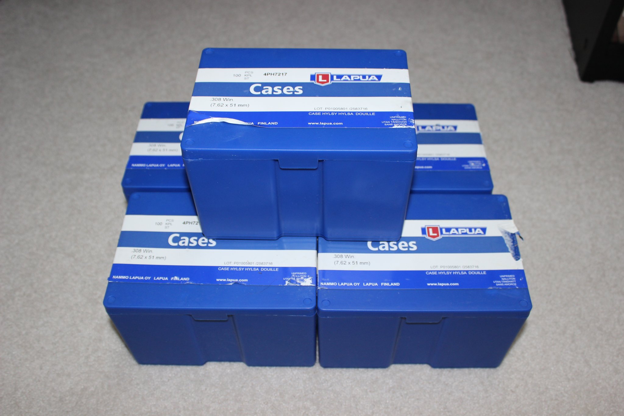 5 boxes of 100 pieces of virgin 308 Lapua brass (large primer)