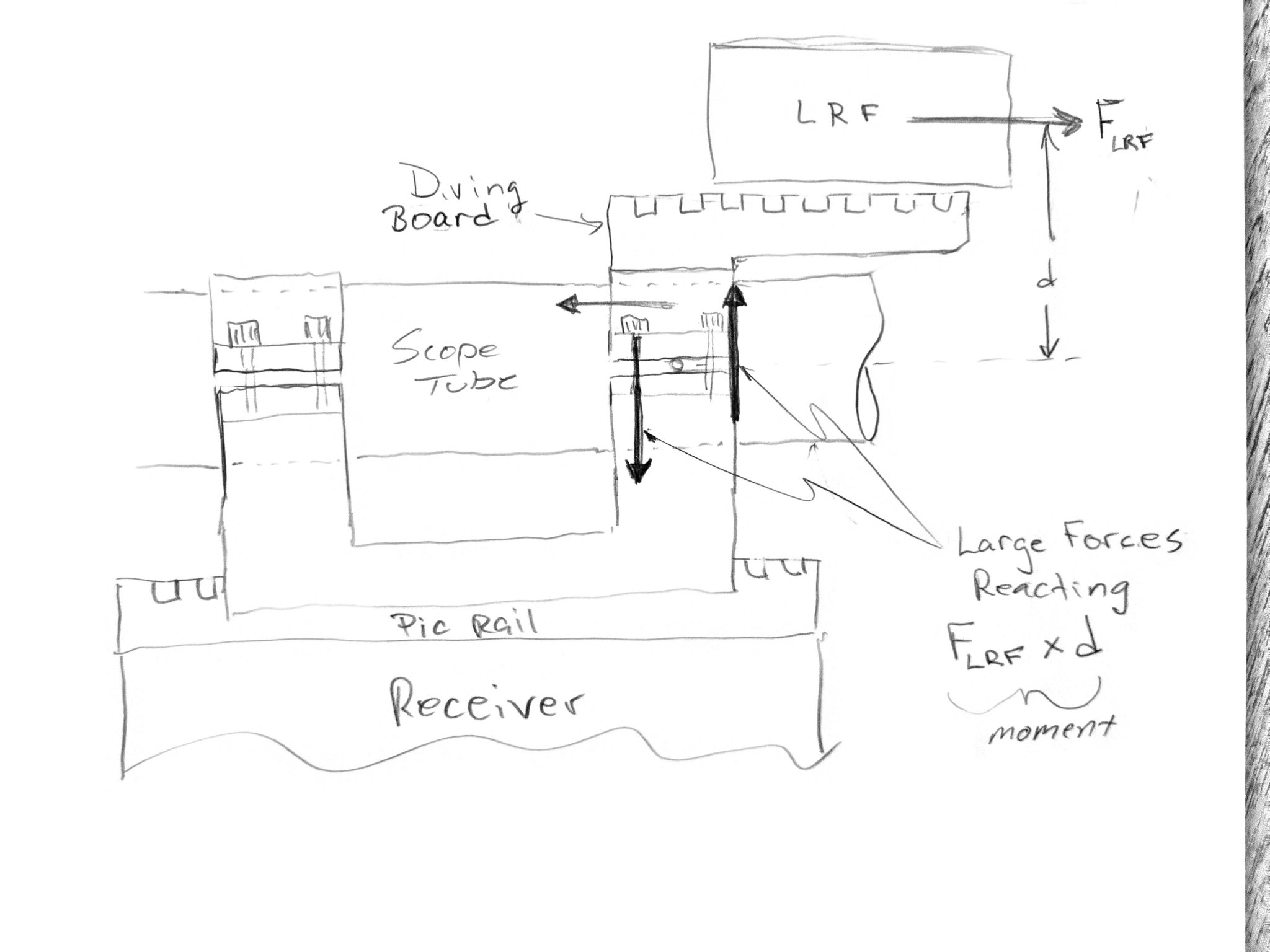 Attaching a diving board to a scope ring cap is, as I like to say, a Micky Mouse solution. Only a non-engineer would offer such a thing. Mechanical engineers don't ignore forces acting on parts under consideration, at least not intentionally anyway. It's also worth noting that there is more to engineering that just running a CAD system. With experience, actual engineers can shape parts with a seemingly innate ability to anticipate the stress state in a part under load. The magnitude of the stress is unknown to them until calculations or computer analysis is done, but they can often (not always) predict where stress will be concentrated. It is with stress in mind that actual engineers design parts. We knew the M-BRACE mount would have to carry a moment (force applied from a distance, kind of like torque) which naturally focused our attention on the connection between the scope mount and the LRF mount. Serrations can bear such loads efficiently, thus their inclusion within the system.