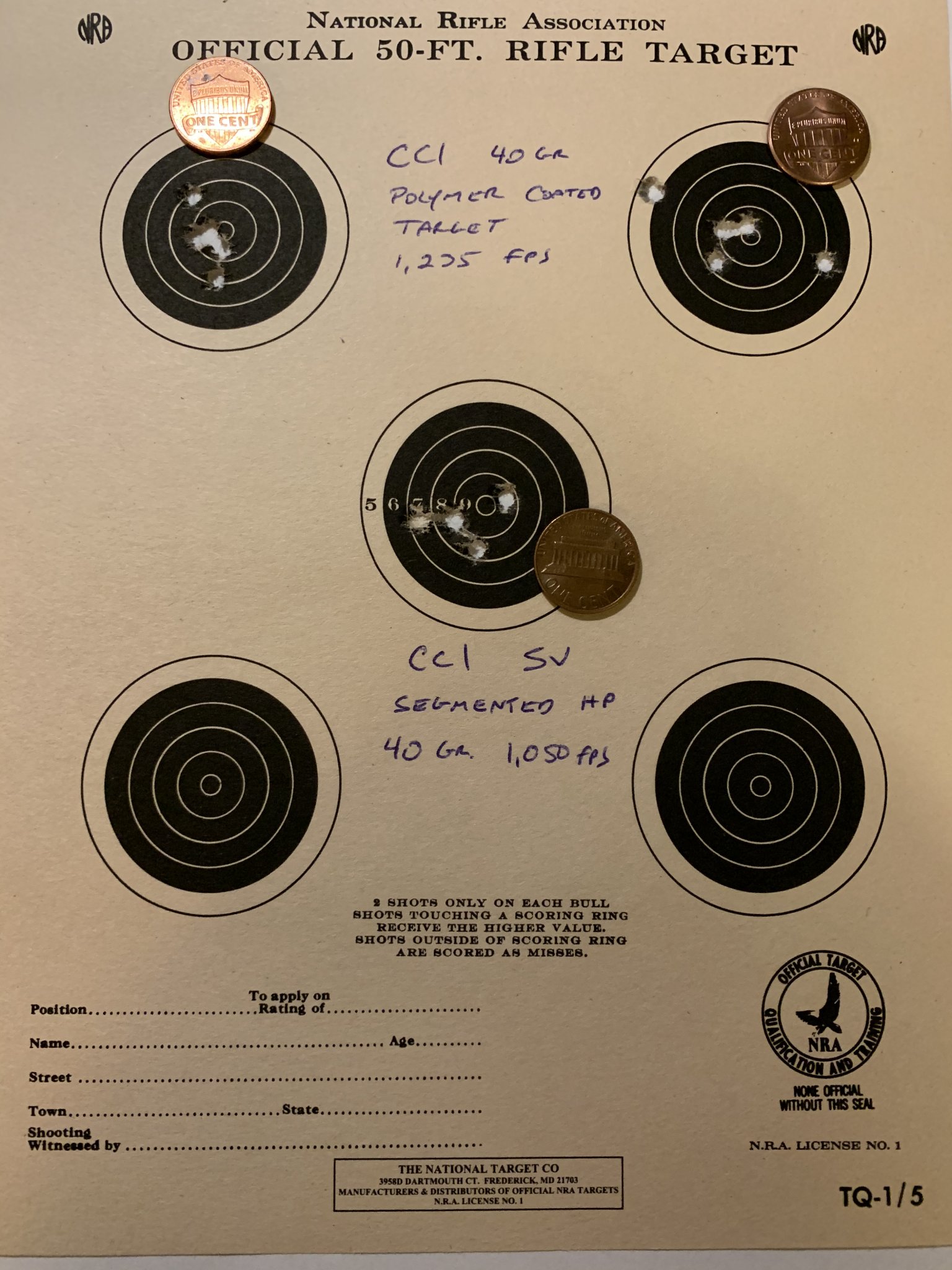 I will update thread as testing continues. CCI SV performed well. Had higher hopes for the HP equivalent. Aguila was the surprise of the day for me. I will be ordering more for sure. Far right flyer on CCI polymer target was me.