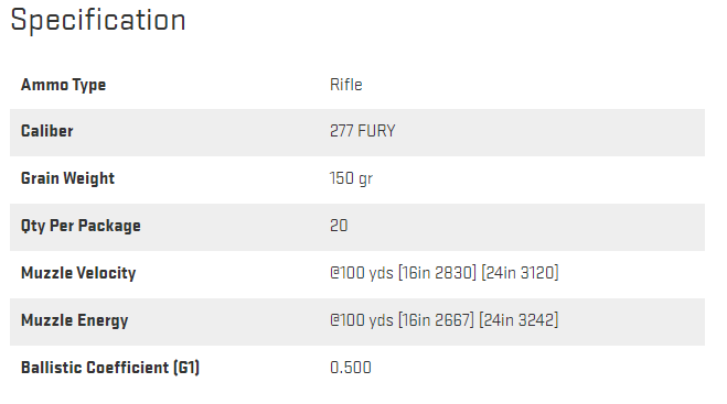 With .277 you've got to know which ammo you'll be dealing with. The brass cased stuff is a few hundred FPS slower with a 130gr than the hybrid case 150gr. I am assuming the 1750FPS 100yd velocity on their site is a typo.