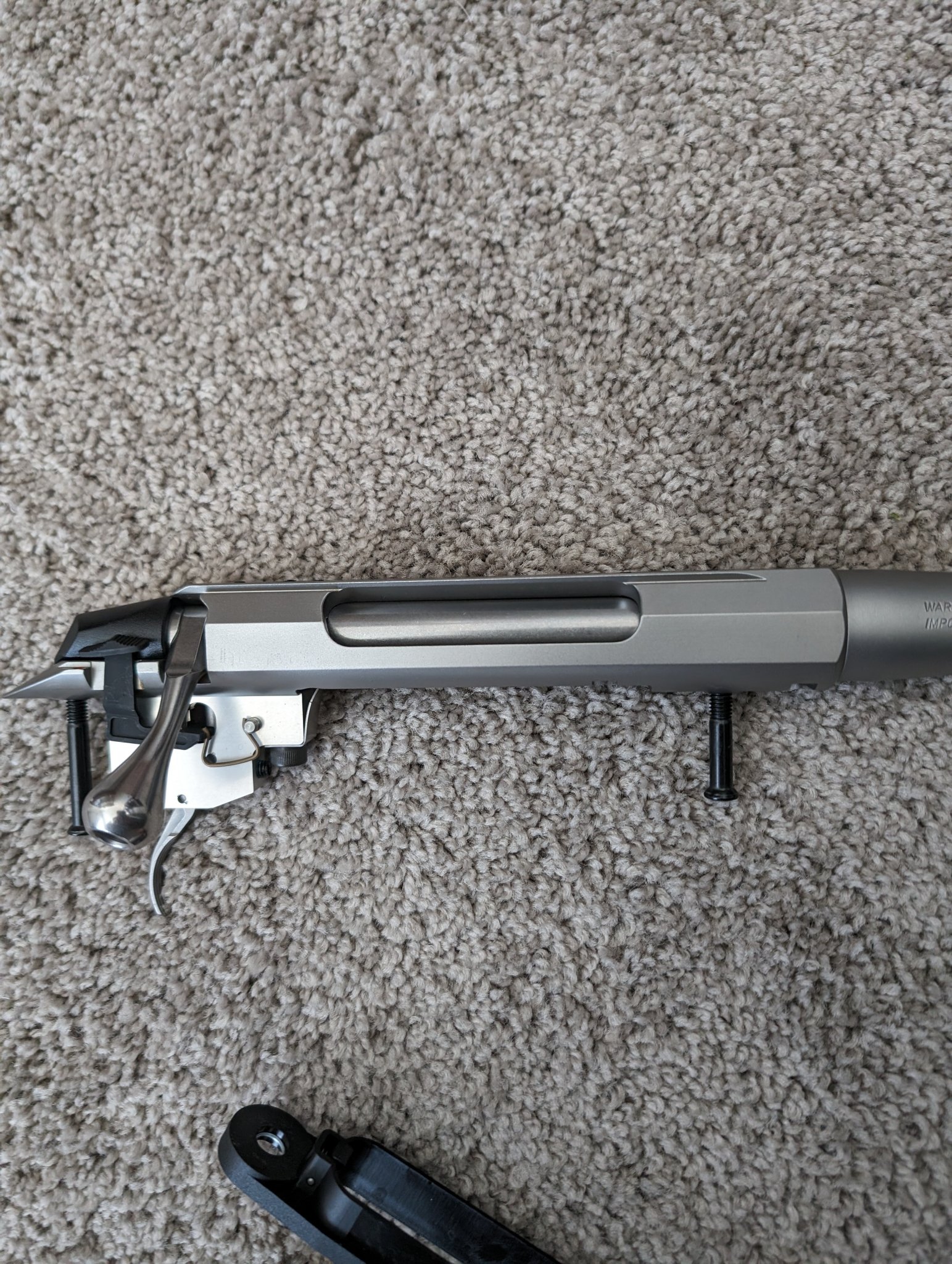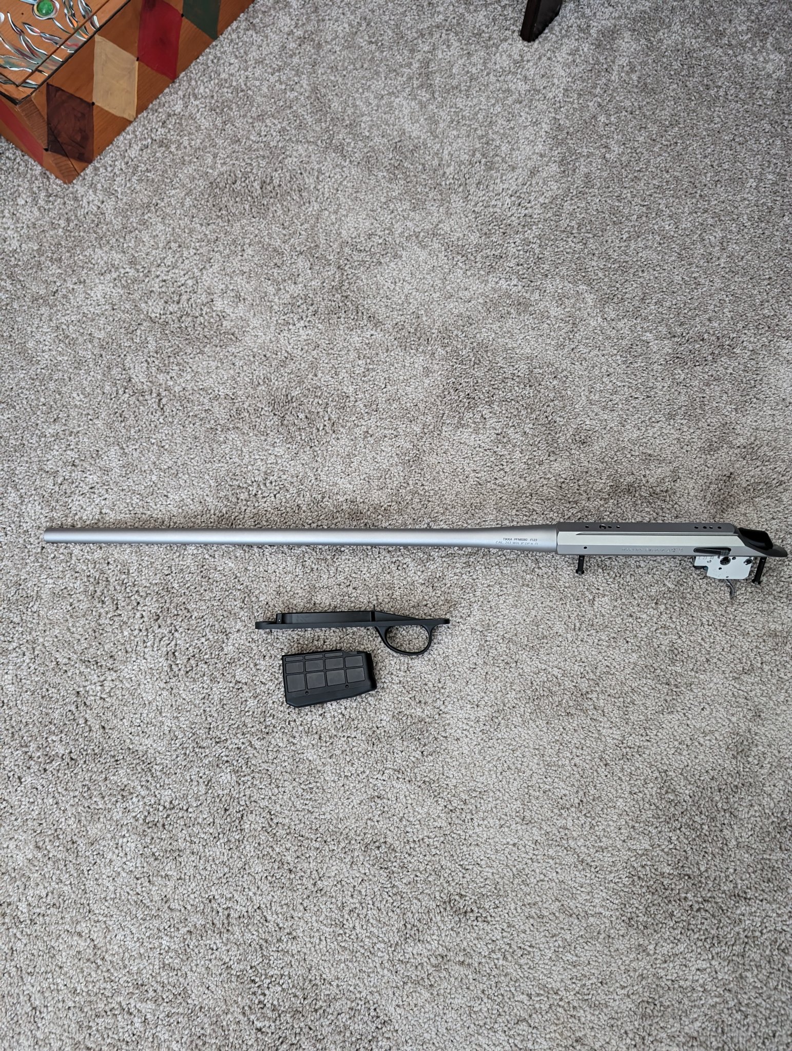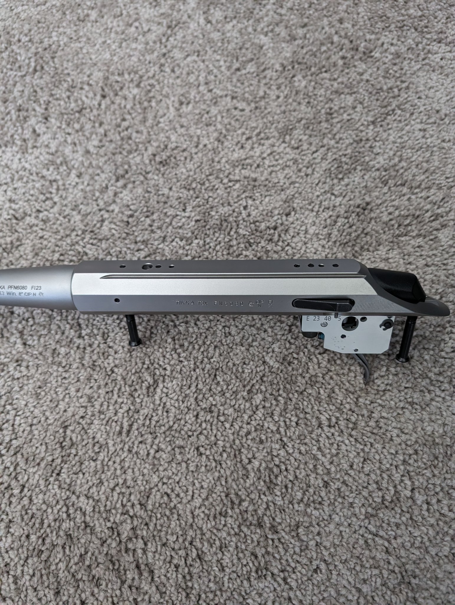 I have a new factory Tikka T3x stainless sporter in the 243 8 twist barreled action. It will come shown in the picture with the action screws, bottom metal and magazine. Included is a new spring for the trigger for reduced pull weight. All you need is a stock.