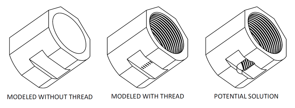 - The designer did not know that it will happen and just saw the benefit of using a standard Savage barrel. Some might think, with modern CAD technology, how can a designer not see that this will happen and the answer is very simple. Many designers do not model threads, as it can be time consuming and technical drawings does not require a model with detailed thread. All that is required is to model the Major Diameter (for a male thread) and Minor Diameter (for a female thread) and then specify the detailed thread specification on the drawing “1 1/16 – 20”. This can cause an unforeseen scenario of the thread breaking through, only to be realized after metal has been cut.