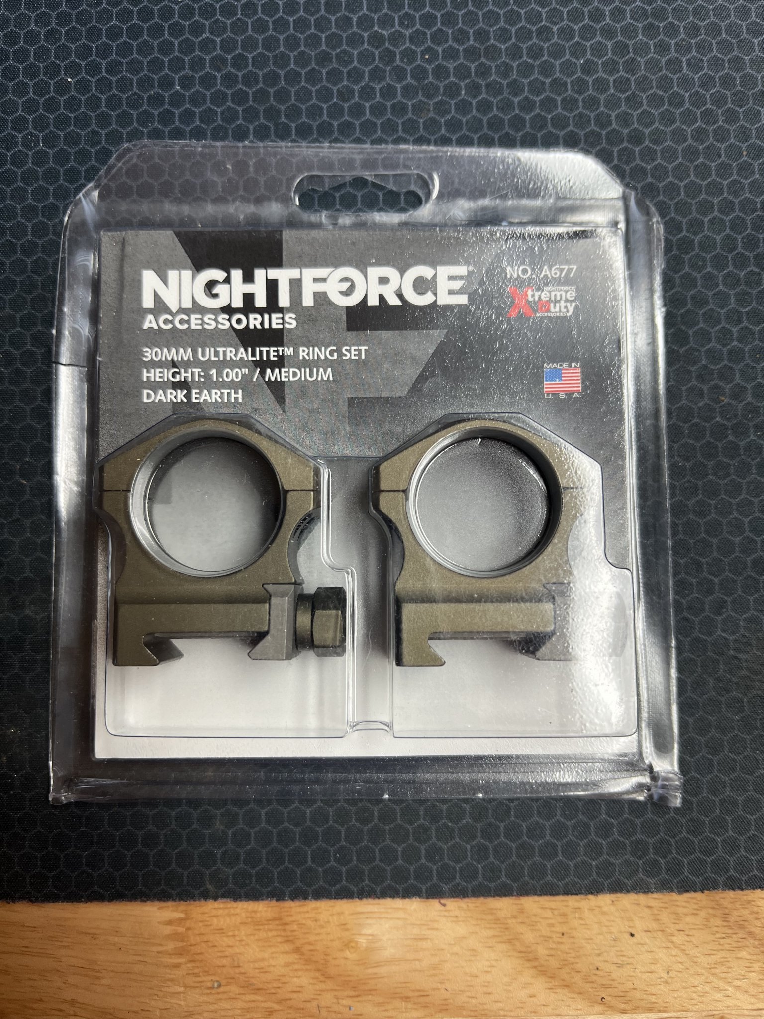 Selling a set of Nightforce Dark Earth 30mm rings, 1.00” height. Small mark on the top of one ring. Includes original packaging and Allen key.