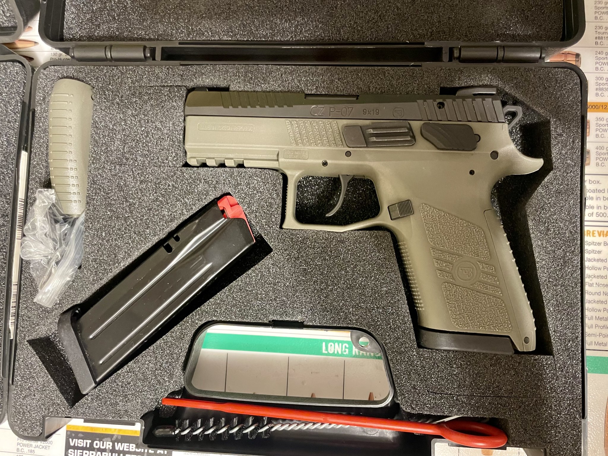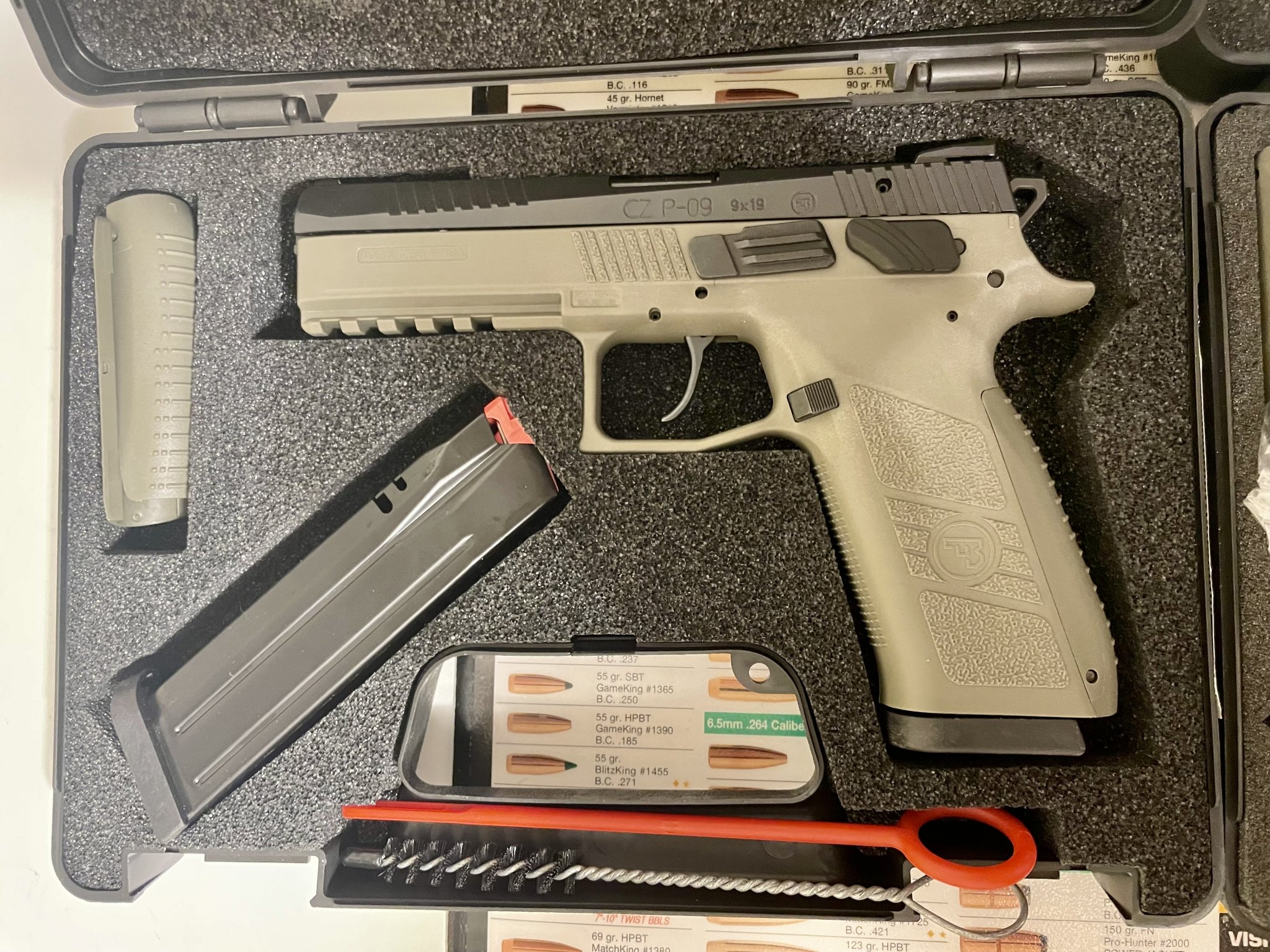 I have 2 pistols here for sale. CZ P07 and P09. These are both “new in the box/unfired”. Night sights. OD green frames w/ black slides. The P09 has never been out of the box. The P07 has been played with some (never fired). P09 has two 19rd mags included. The P07 has two 15rd mags included.
