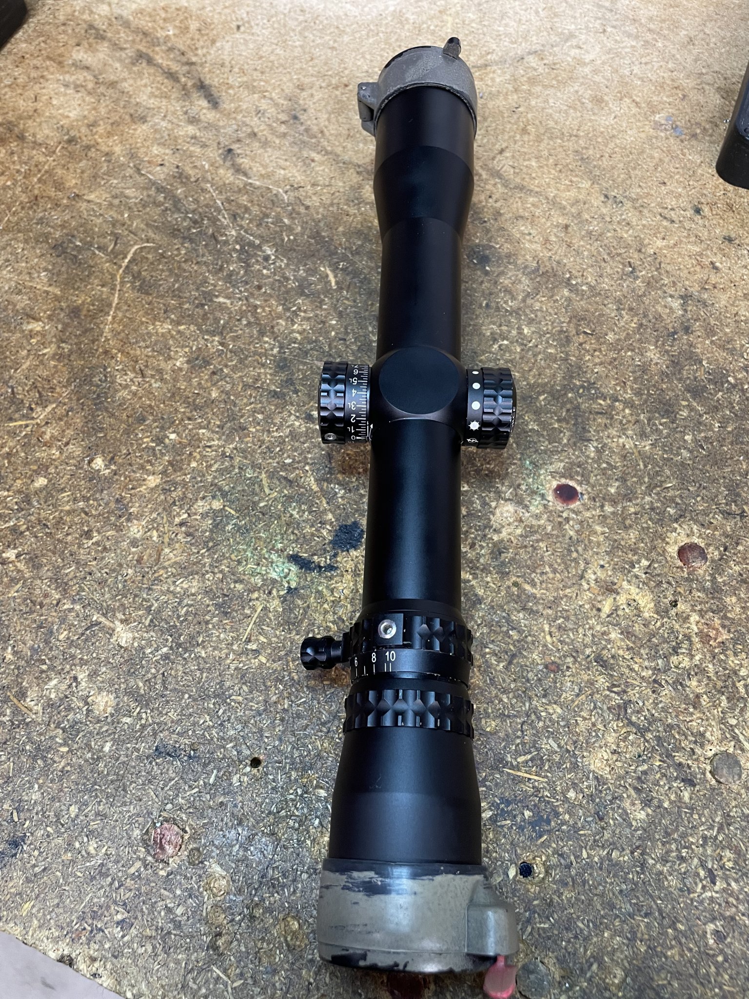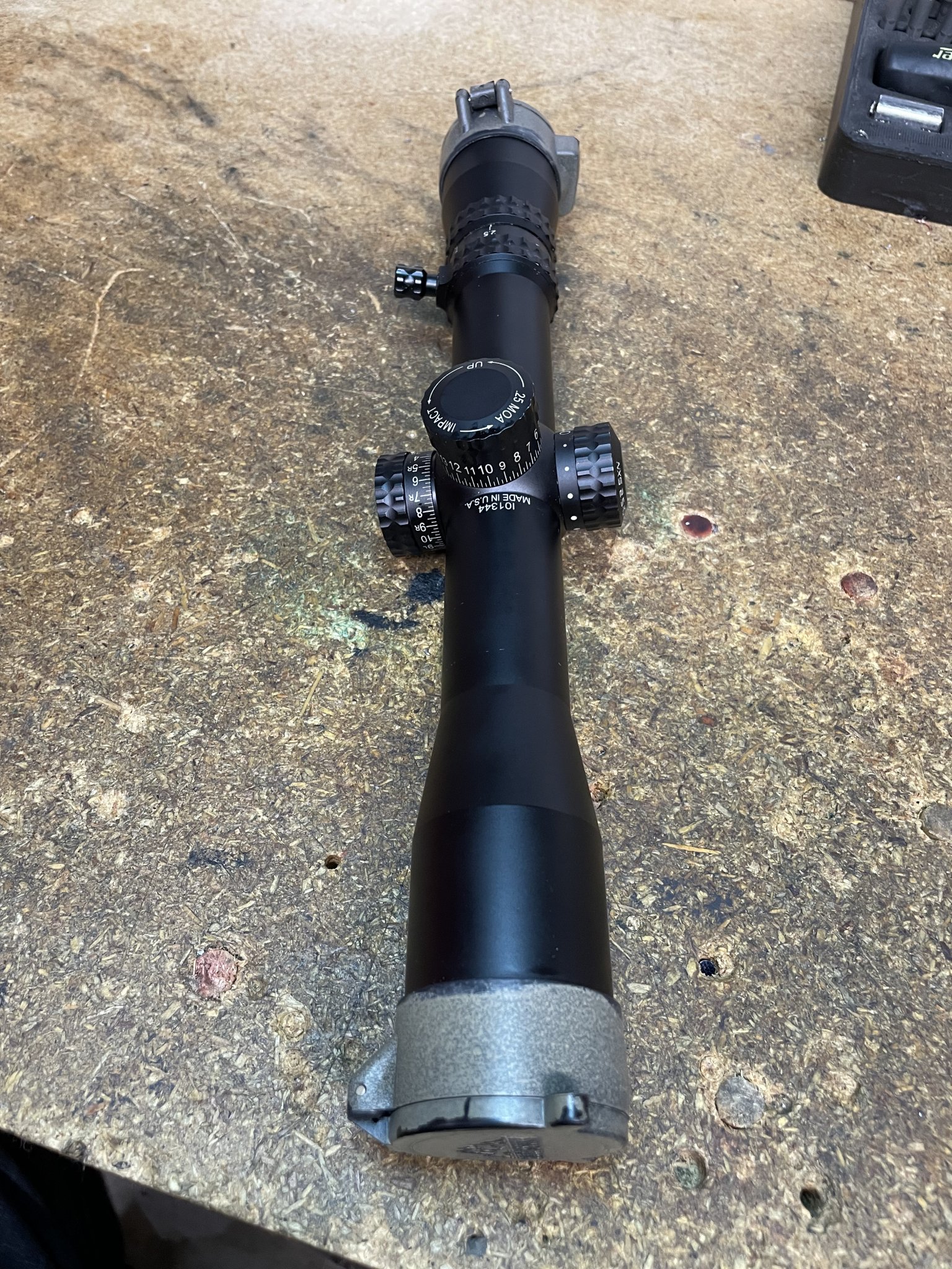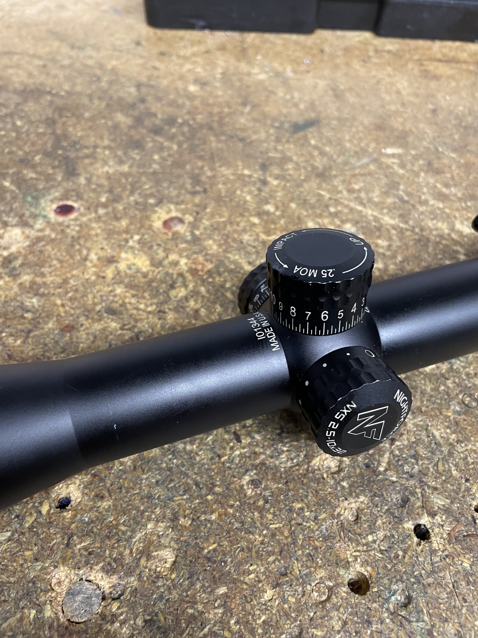 Nightforce NXS 2.5-10x32 scope. Mil dot reticle, .25 MOA turrets, illuminated reticle, zero stop. Second focal plane. I’m the second owner of this scope. I’ve used it for approximately 400 rounds of 5.56 and it has been flawless. Some minor wear and ring marks. Glass is spotless. It will ship with painted BC caps for protection but you’ll probably want to replace at least the front as it barely stays closed. I do not have the box or manual. I do have the plug for the magnification knob if you prefer not to use it.