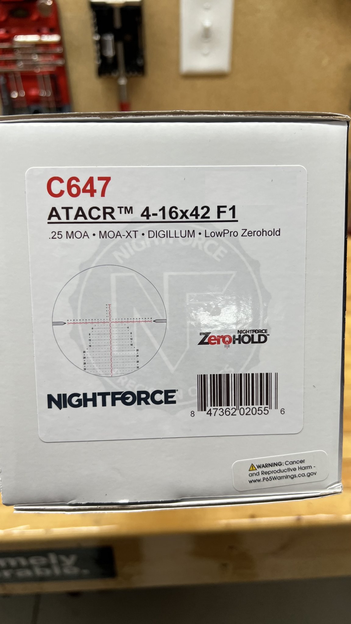 Nightforce ATACR 4-16x42 F1 with the MOA-XT reticle. It was mounted and has around 100 rounds on it. It is like new and the glass is in perfect condition.