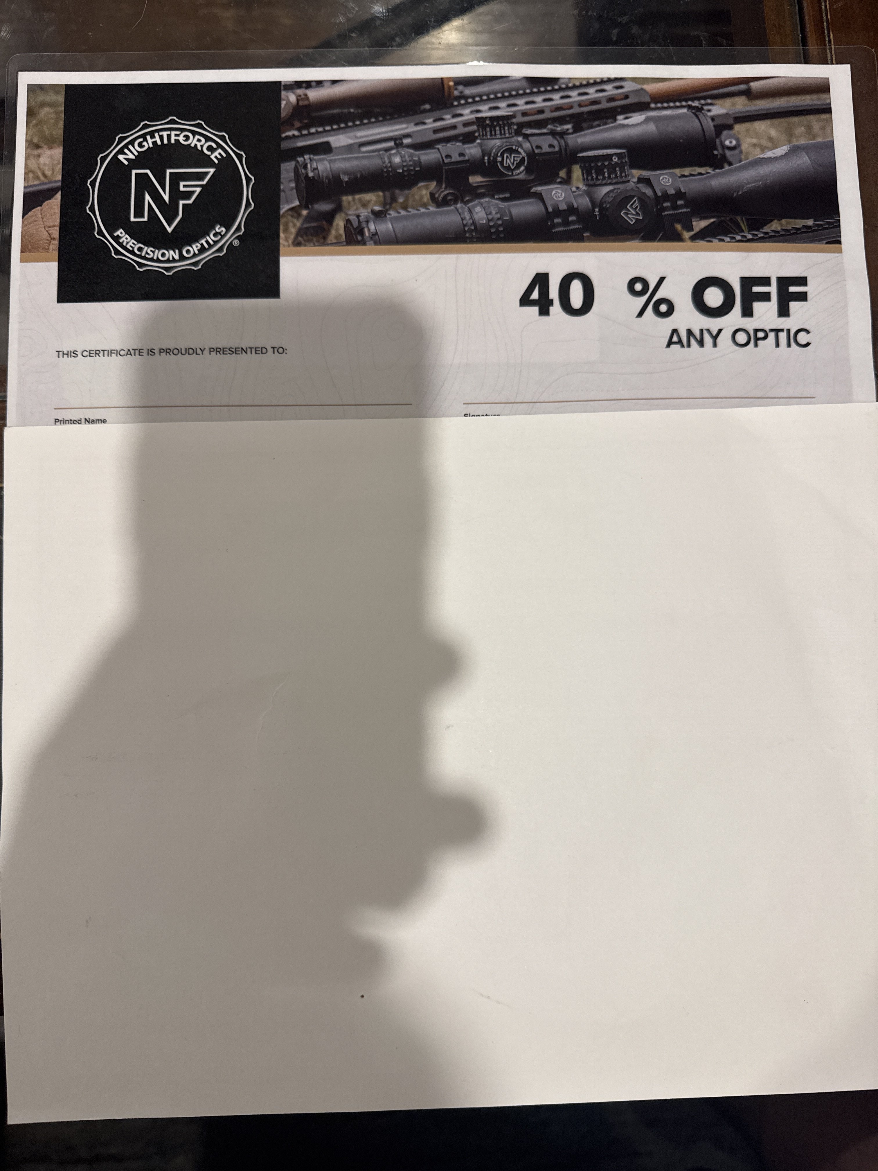 I have a nightforce 40% off cert up for grabs. It's redeemed through nightforce and all further redemption details will be given after sale. Expires 6/7/26. 475tyd