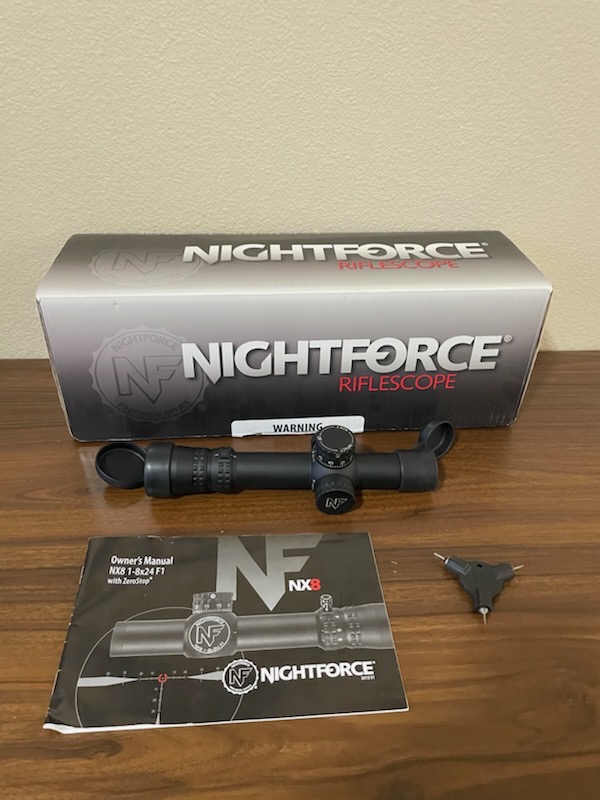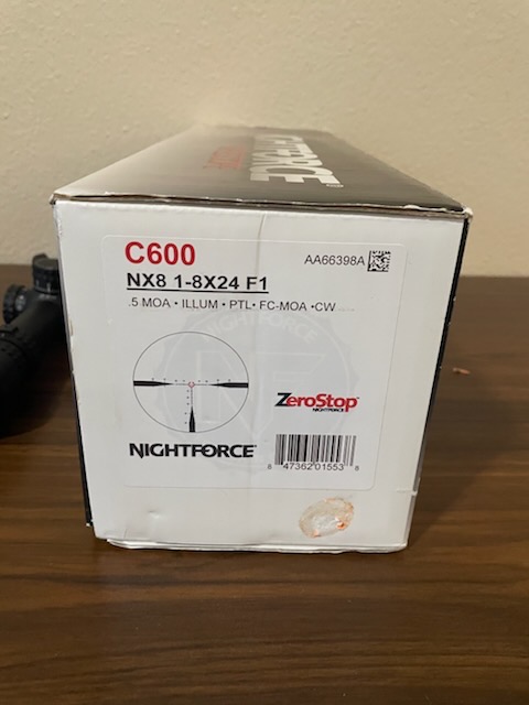 Selling my gently used Nightforce Nx8 1-8 LPVO F1, Model C600, .5 MOA, Illuminated, PTL, FC, MOA, CW. Box matches serial numbers on optic. $1400 shipped.