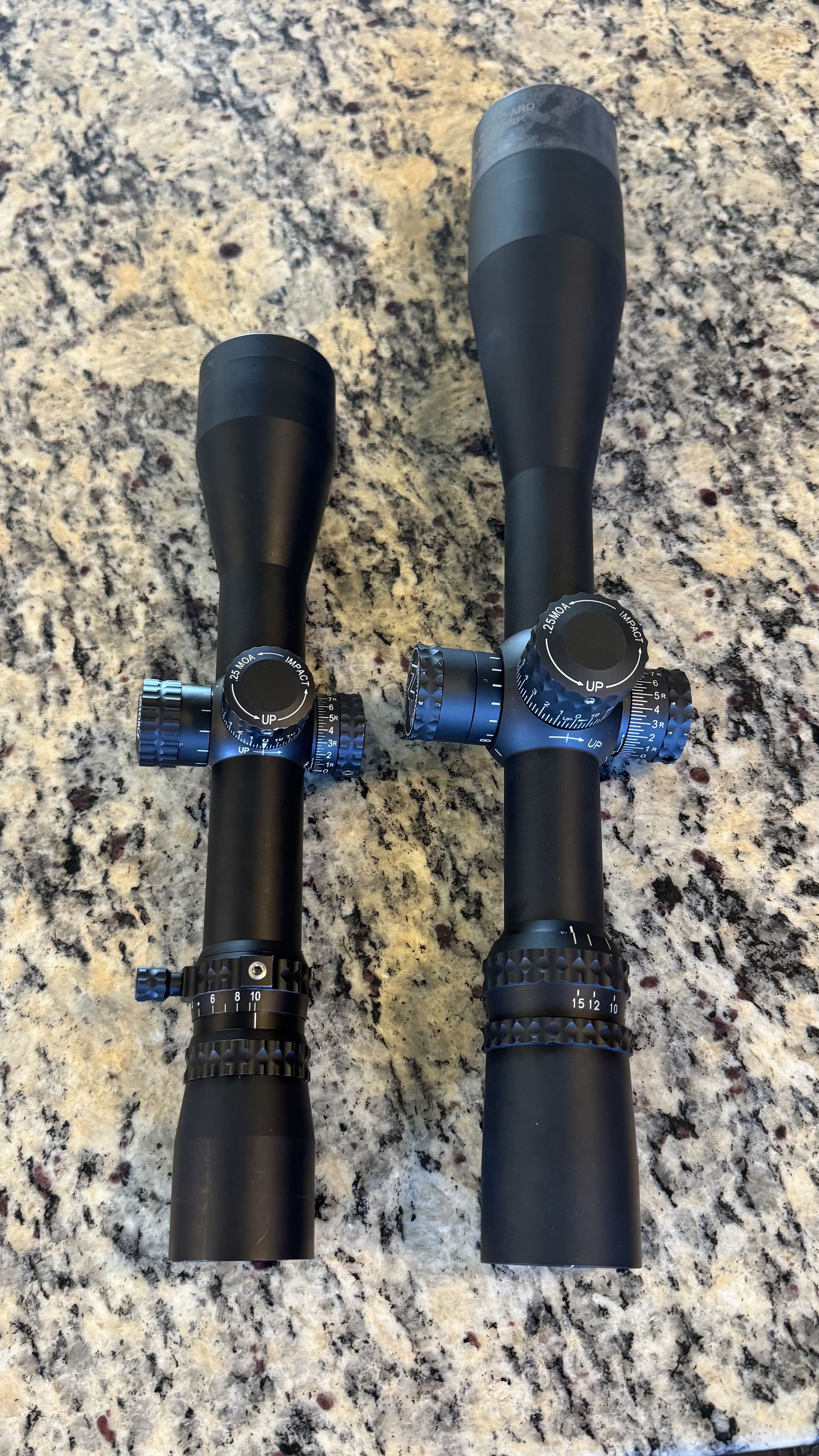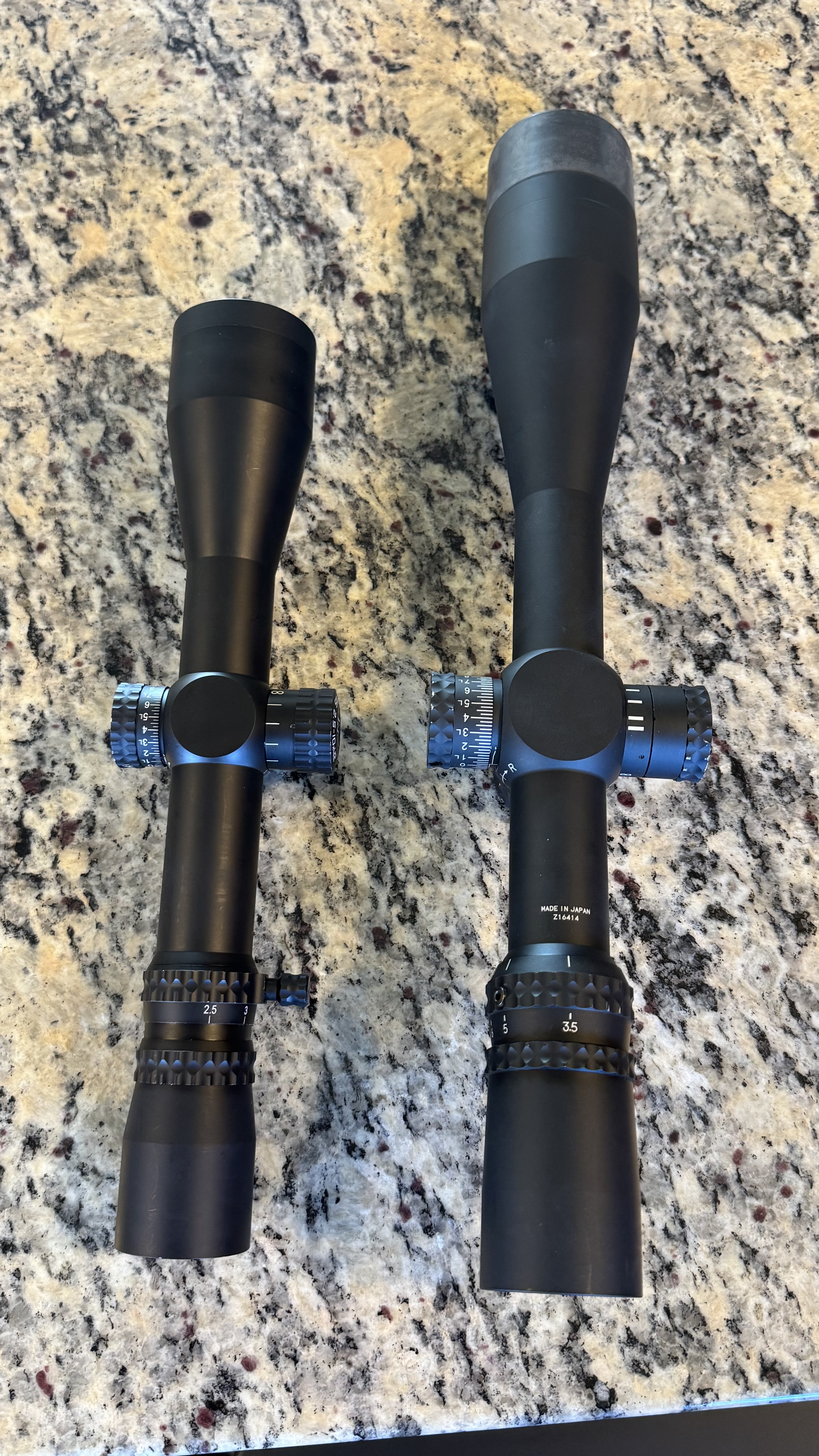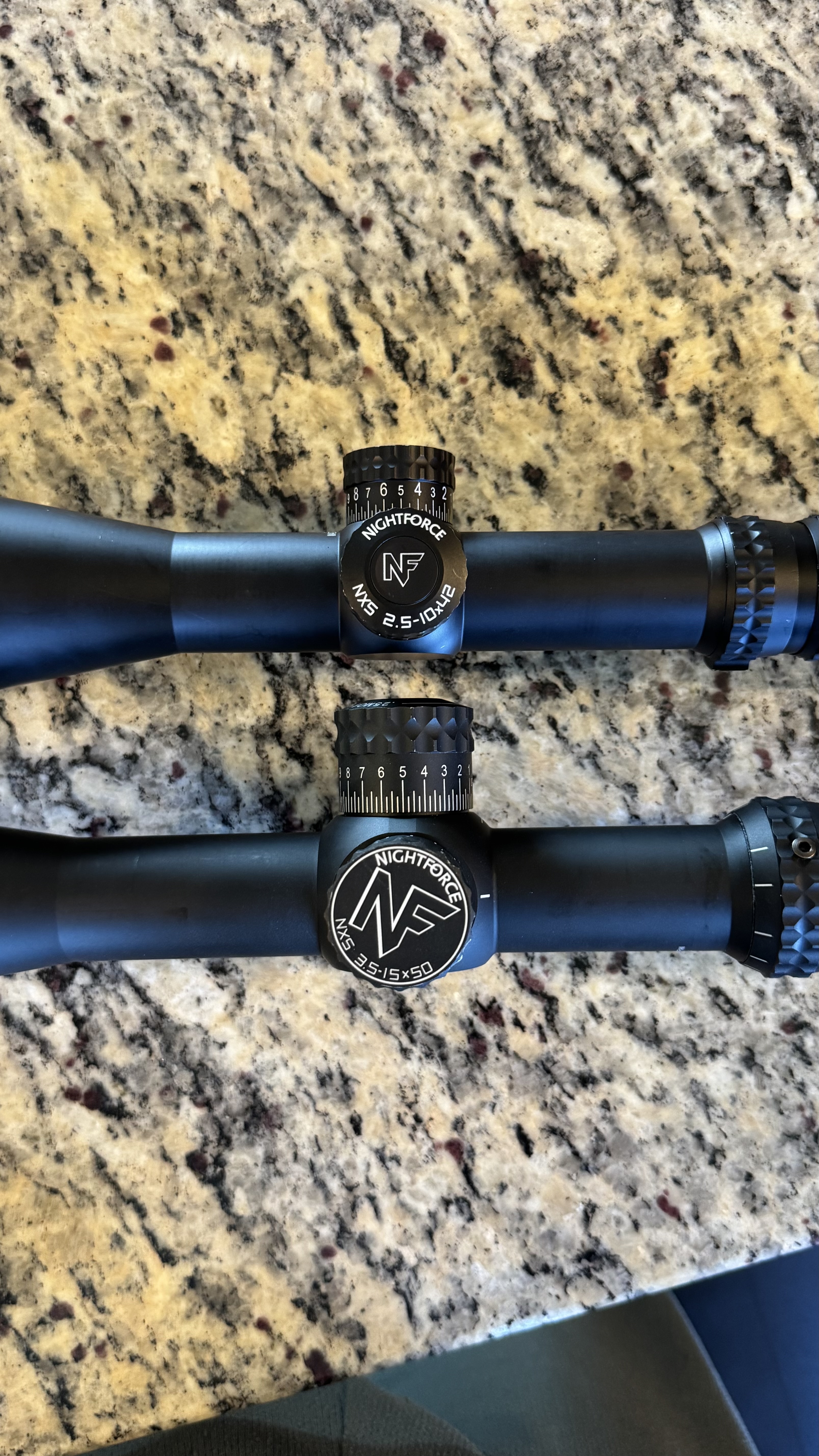 Both are in great condition. Glass is free of any scratches. No box for either of them. They both have the Velocity reticles. Both have HS turrets and Zero stop. 3-15 includes a NF kill flash.