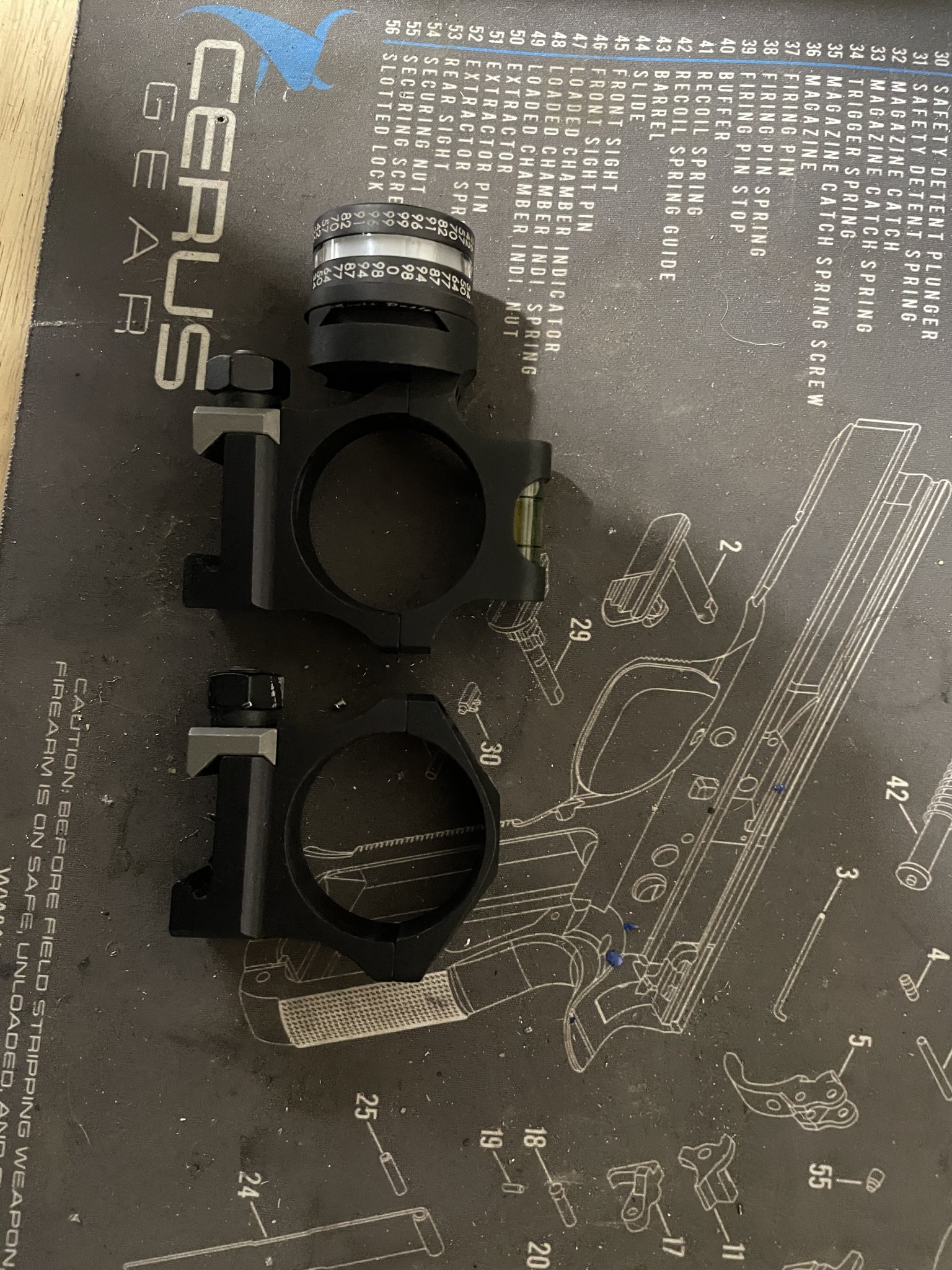 Nightforce Xtreme 34mm rings (high 1.125), bubble lever top ring with angle indicator mount and angle indicator. Was mounted on a comp gun for two seasons. Obvious marking/scratches on the locking nuts. Everything was always torqued with fix it sticks. Setup was 450+ new. Looking to sell for $270 shipped, or trade for a red dot (RMR, DPP, Acro, Holosun, will consider others) and or offset mount (or an acog red dot mount without bosses, ring style for an rmr). Will absolutely add cash for trades
