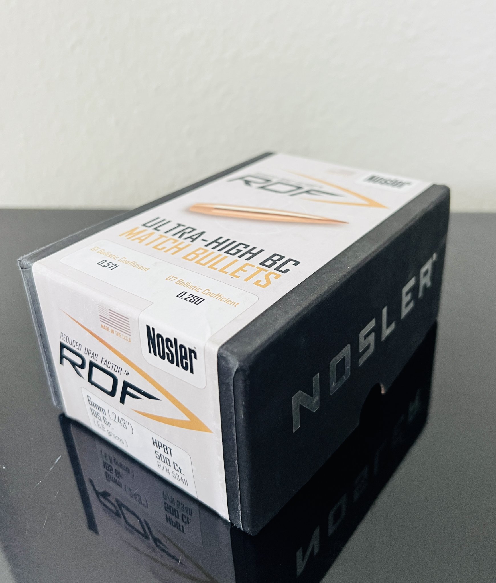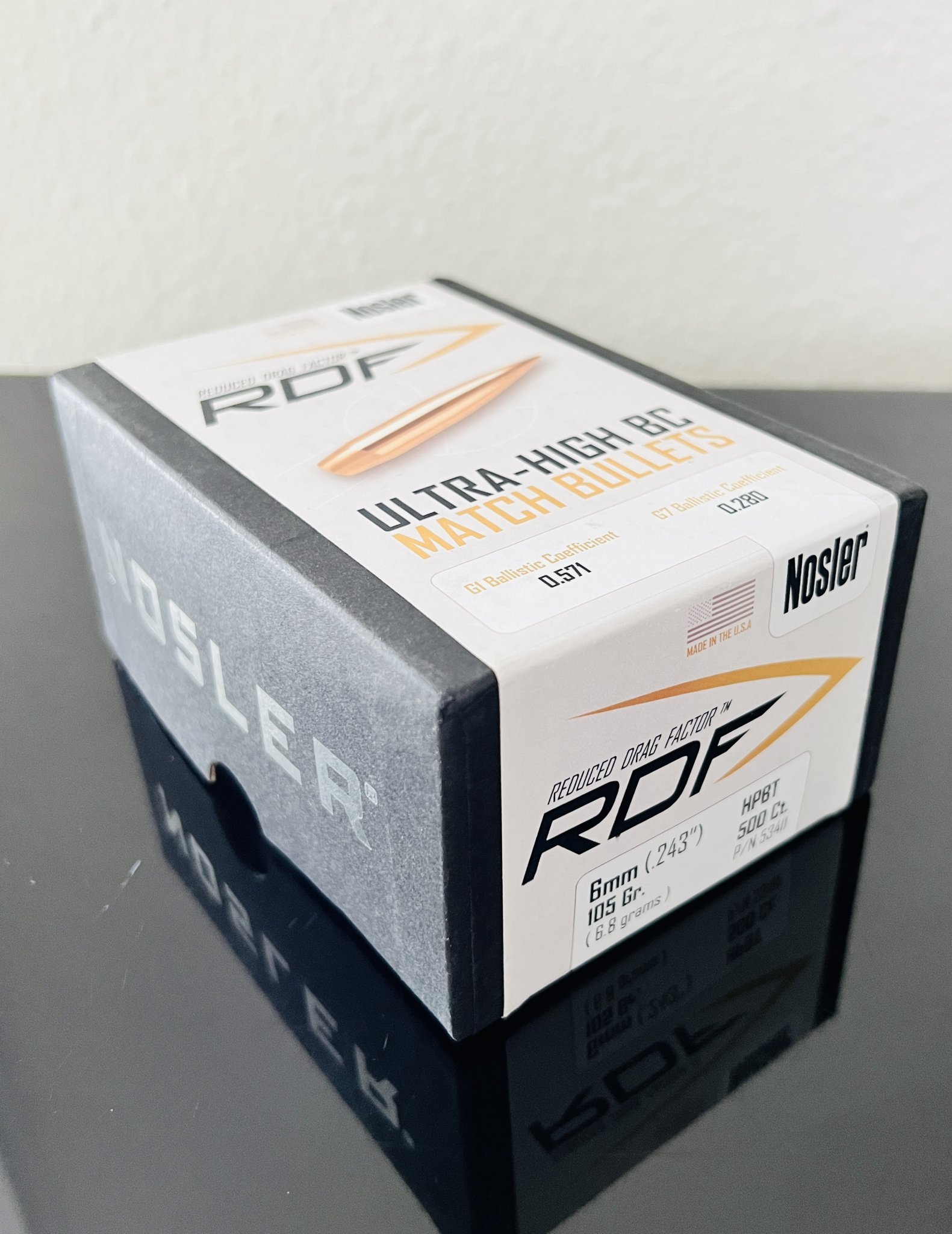 Brand new Sealed 500 count box of Nosler RDF 105 gr for sale. G1 BC 0.571 G7 BC 0.280