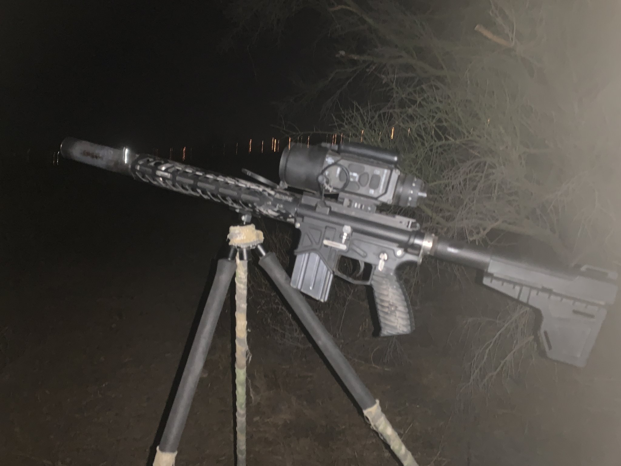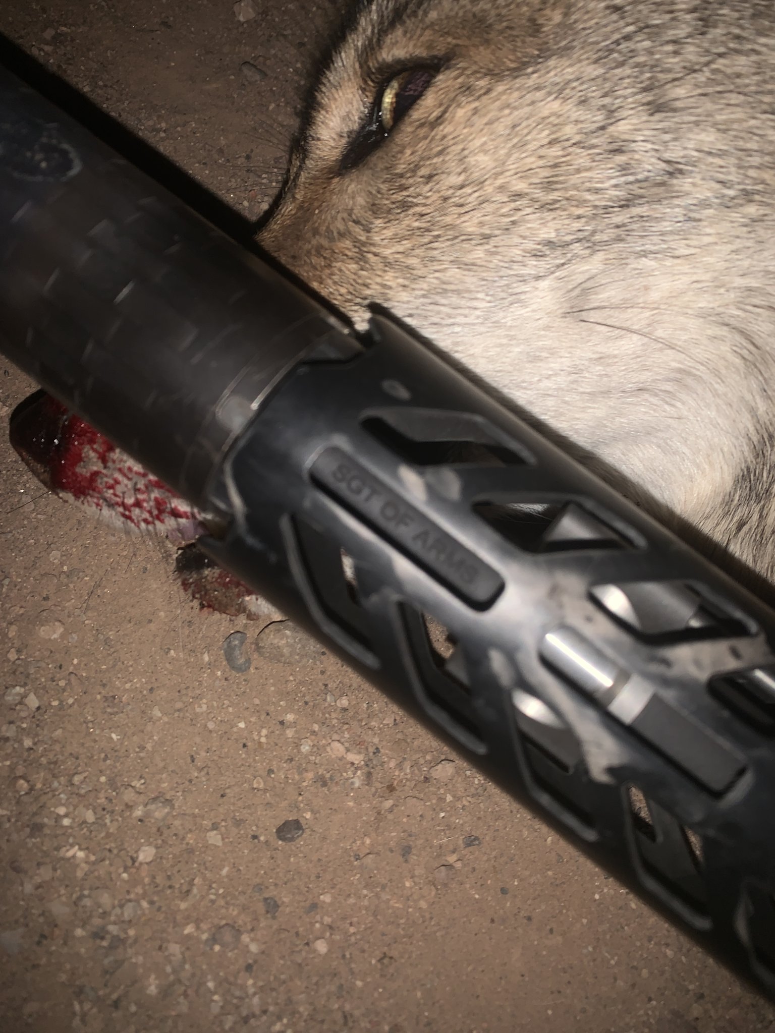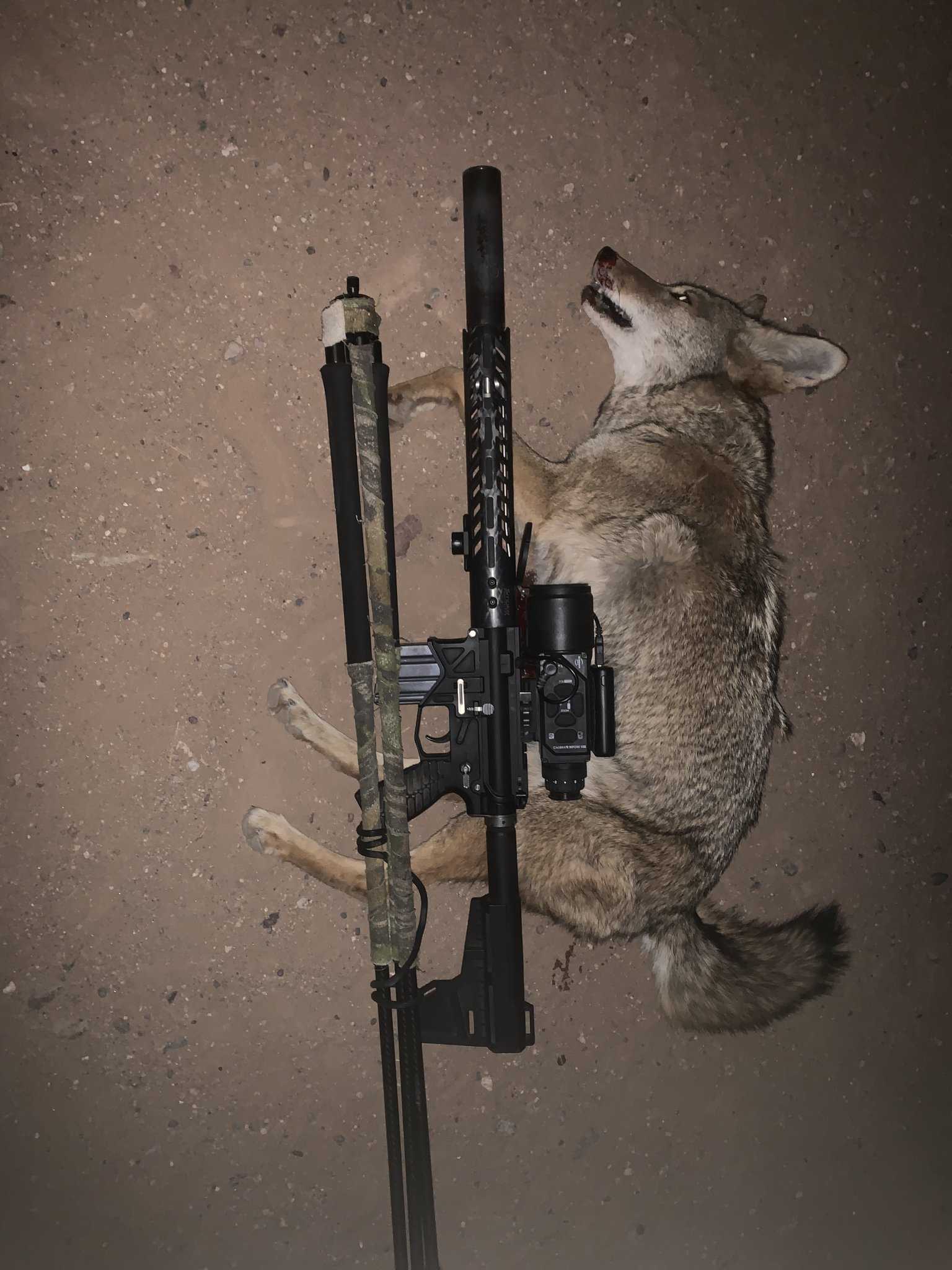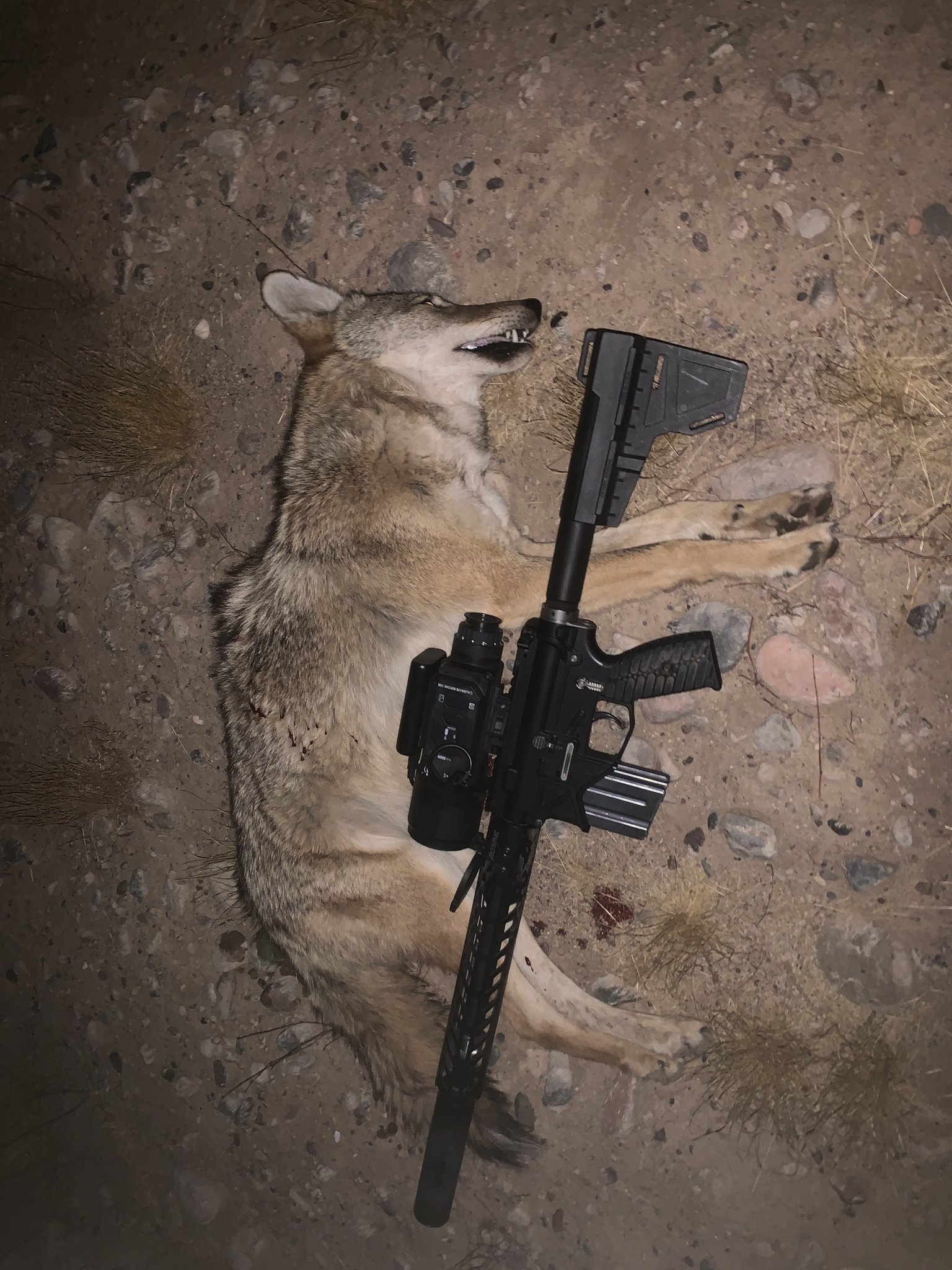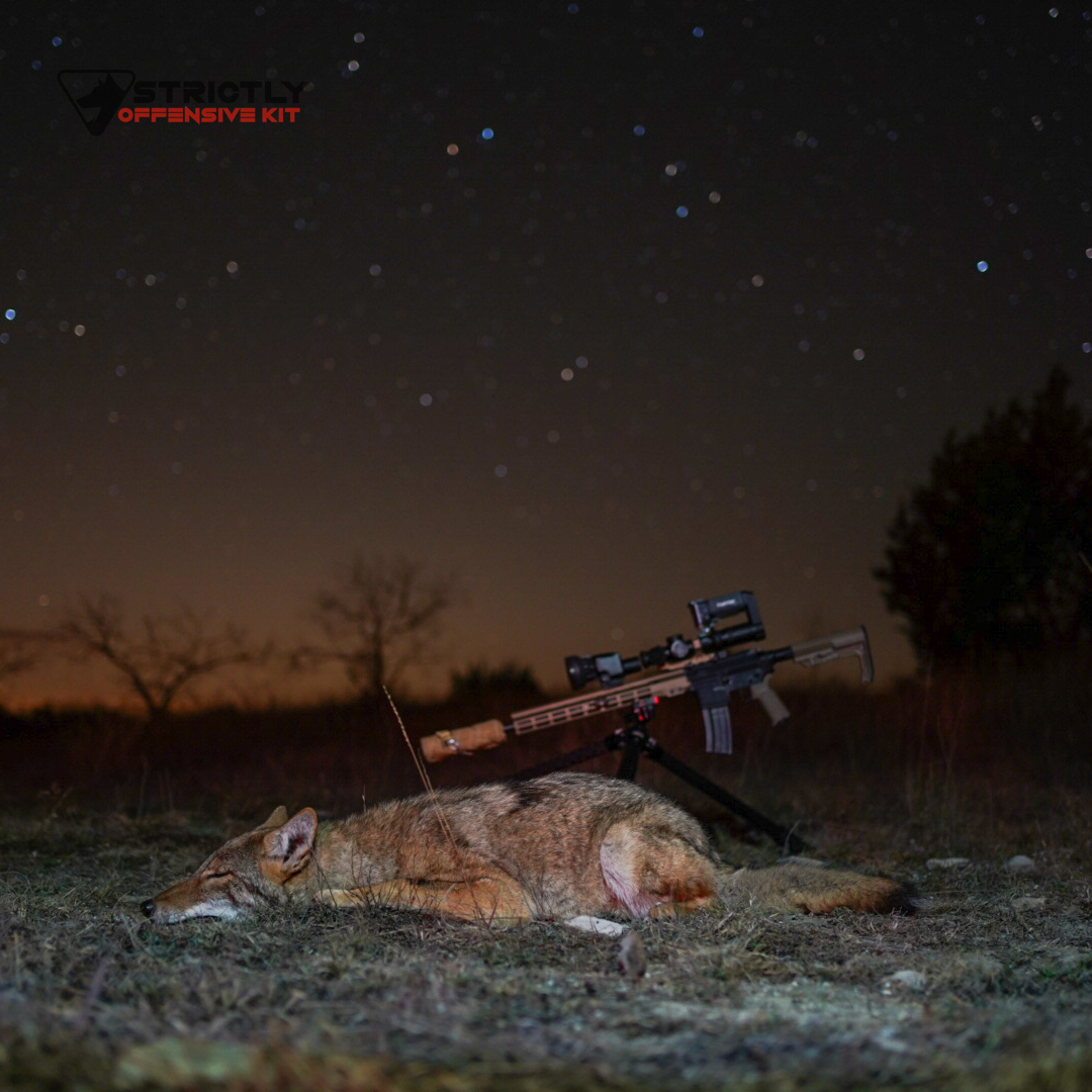 So the son that never hunted Coyotes till this week gets a plan and seeks to get revenge for the family dog. He takes his low-end on-sale like DD build AR15 lightweight, with a real low-end Leupold, low-variableX with 32 obj. with real crappy eyebox and mounts it to AR. He cant afford NV, but he takes a Flashlight and tapes it to the AR in case of a shot in the dark comes into play.