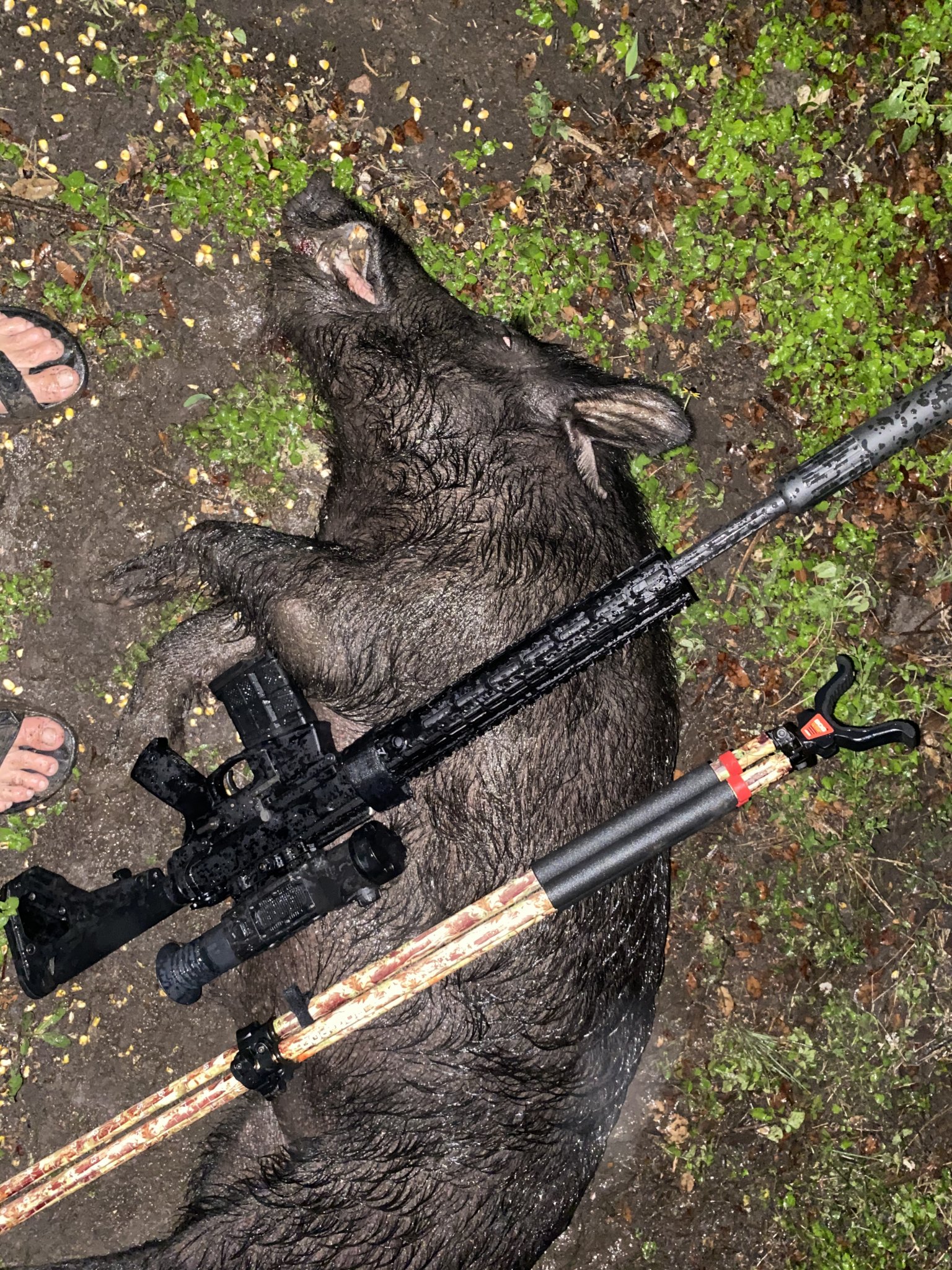 Shot this guy at about 4:30 this morning. I hit him a little farther back than I wanted to, which usually results in a lost hog. Most of the hogs I don’t drop on the spot I lose in the brush, so I always go for the neck. I was half asleep, I rushed the shot and hit lungs. I got lucky this time.