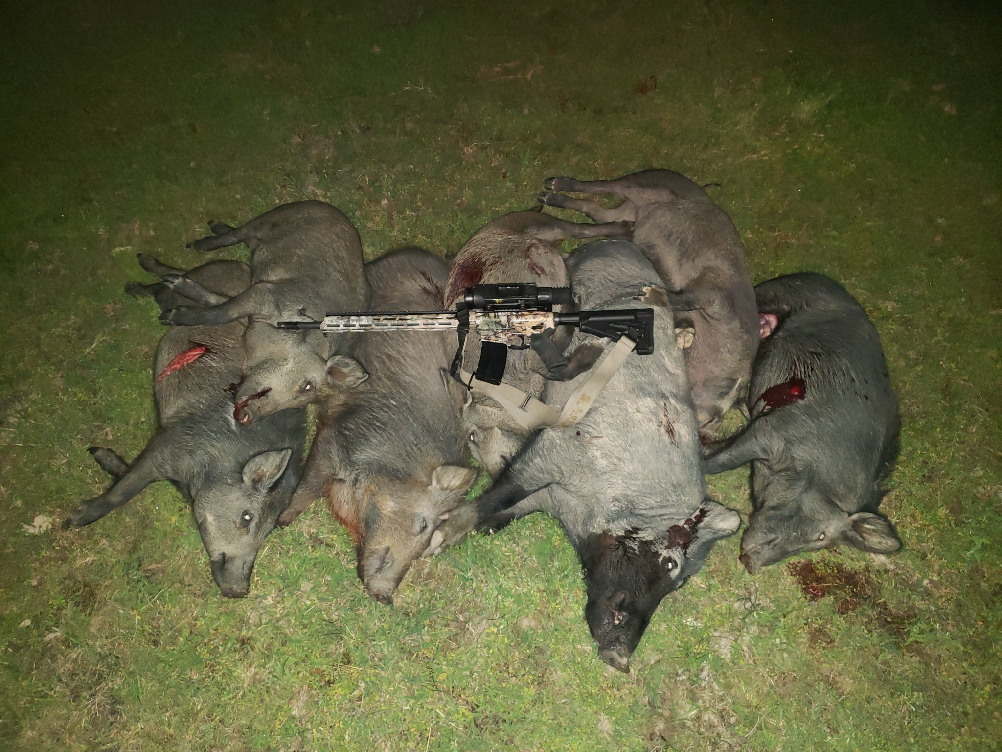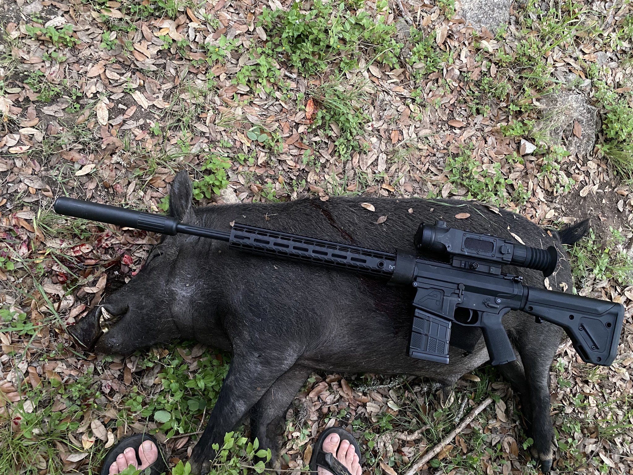 I have both a Trail XQ50 and a Trail XP50. I’ve been using the XQ for the last month or so on a recently built AR10. The XP will be relocated once a 338 can for another AR10 is approved, then I’ll be back to it. With the two set the same (magnification, contrast, etc.) the image quality looks really similar to me. It may be something about how I have mine setup, but past 60-70 yards hogs look like a glowing silhouette with both. I can see a lot of detail closer in. Because of the trees and brush I hunt around I end up really close to hogs fairly often, and the lower magnification on the 640 scope is really useful, that’s the big benefit for me. To bring us back on subject, here’s a kill shot from earlier this year where a small boar I called in came within 25 yards or so (XP50, pre image boost update). The XQ50 is not ideal for situations like this.Do you have any 640 res pulsar scopes ?