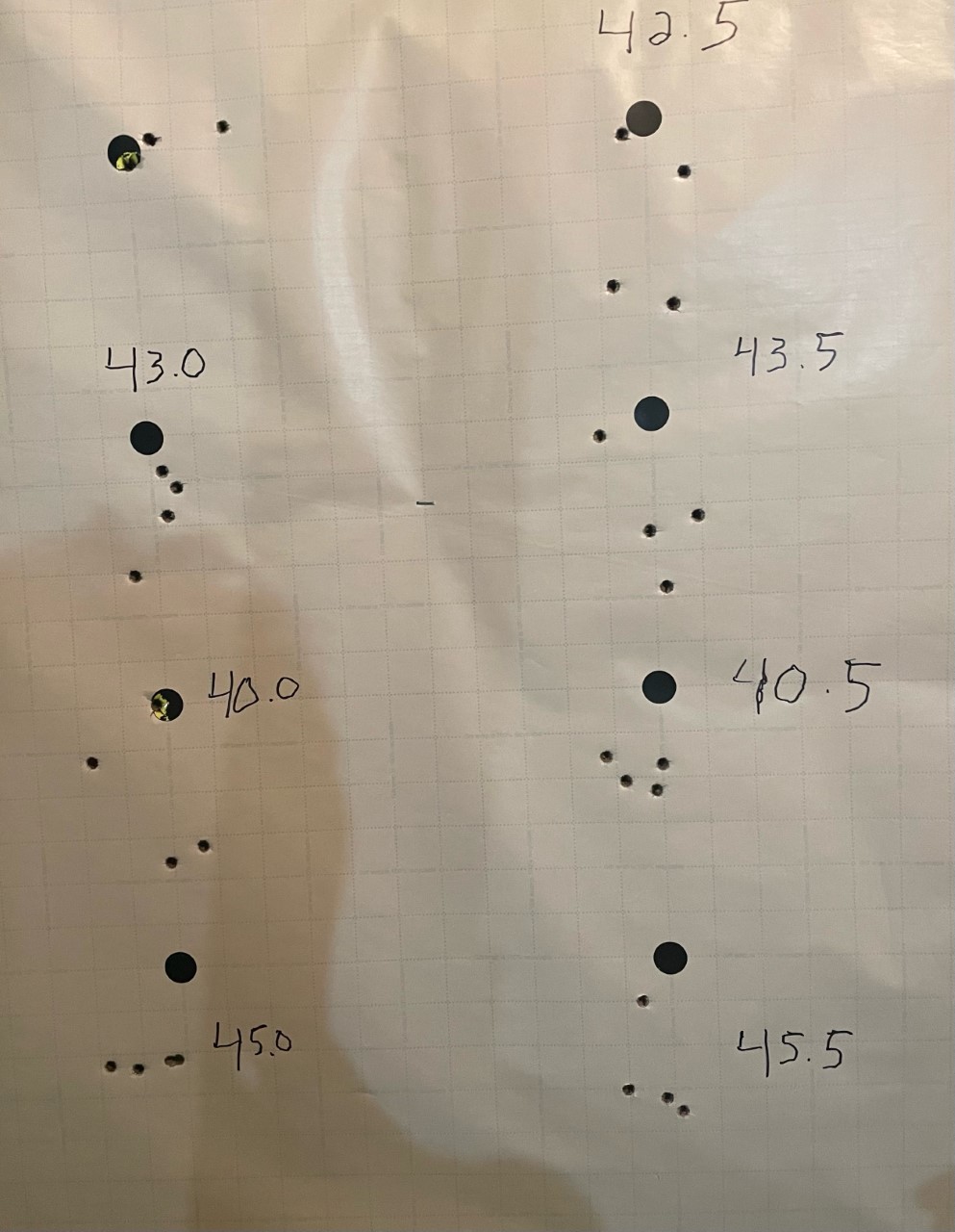 These are 175SMKs using N550. I have velocity details as well but was able to work up to 45.5 (max charge is 45.7) with no pressure signs. Obviously, recoil was noticeable at 45.5. Also, I accidentally wrote 40.0-40.5 which is actually 44.0-44.5. Sorry.