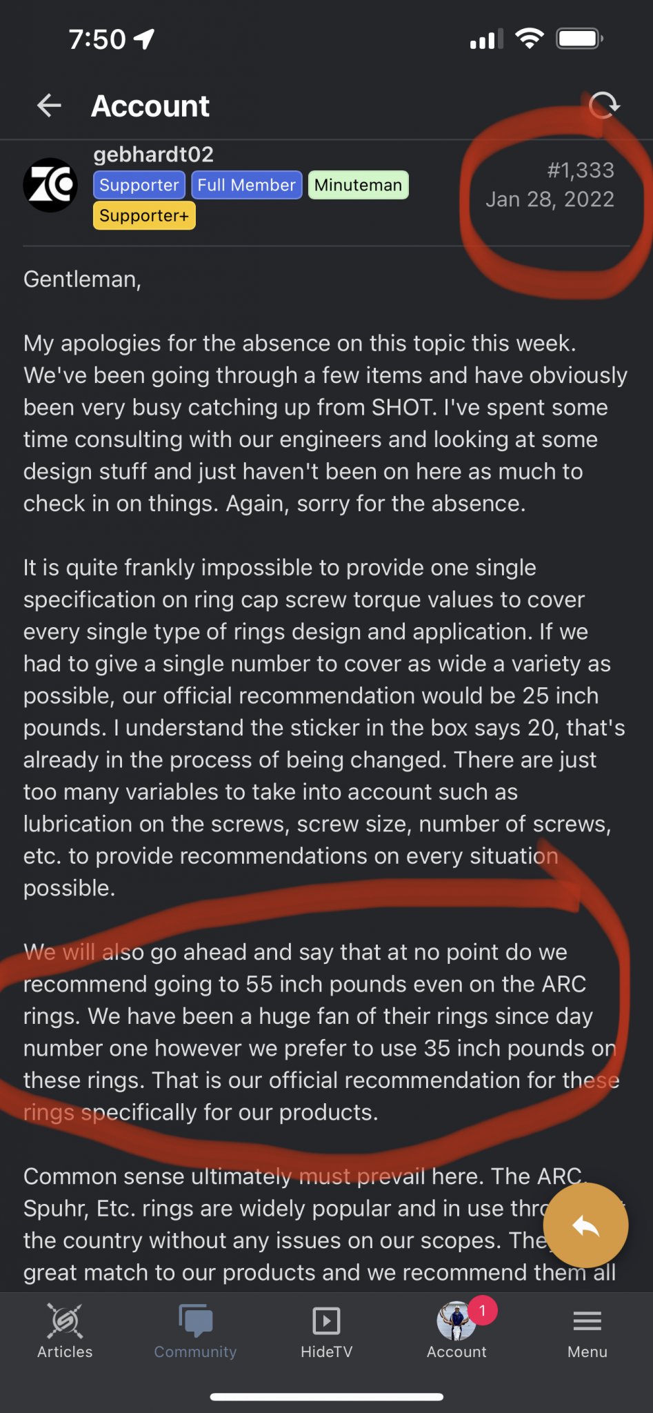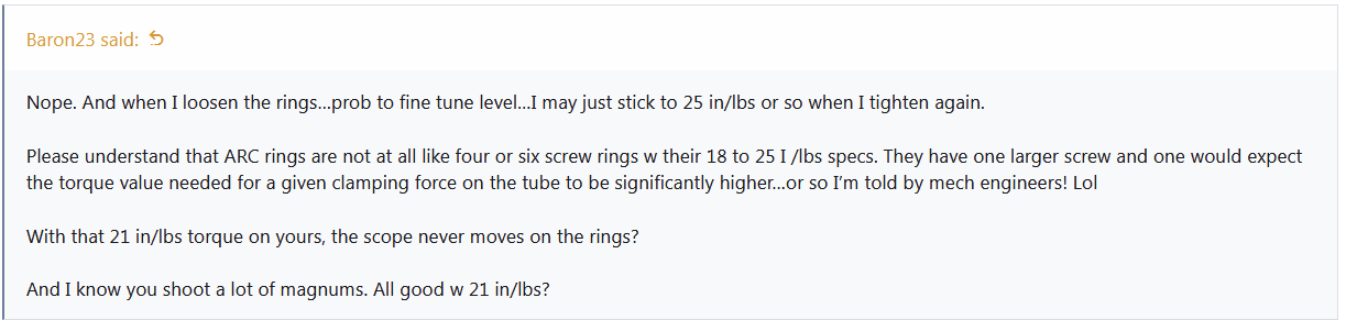 One thing...I do love and use ARC rings and did indeed follow the meandering and somewhat inconclusive threads about torque values with ZCO and ARC rings. I have a Mk5 5-25 in ARC rings torqued at 53 in/lbs (closest fix-it-stick limiter I have to ARC's recommended 55 in/lbs) and no problemo. And, I do vaguely understand Ted's explanation about multiple small screws vs one big one and the applied torque values needed in these different situations in order to obtain the same resulting clamping force (right term...maybe??) on the tube .
