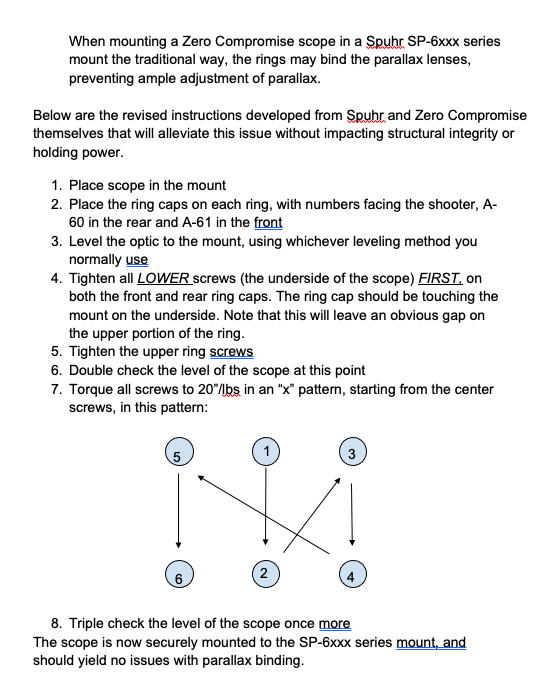 We sold HTI-416 his rifle and the scope along with a Spuhr mount back in May of this year. We mounted up the Spuhr mount according to the instructions from Spuhr, keeping an equal gap on both sides of the ring cap. Torquing everything to spec. Recently those specs changed (months after we sold this scope). Now mounting a ZCO in a Spuhr, you are now to tighten the bottom ring cap to where it touches the scope mount. The scope ring caps are then tightened to 20 in lbs in an X pattern, not the previously specified 25 in lbs.