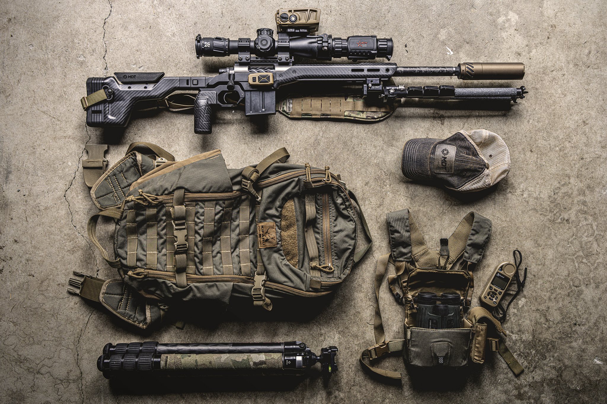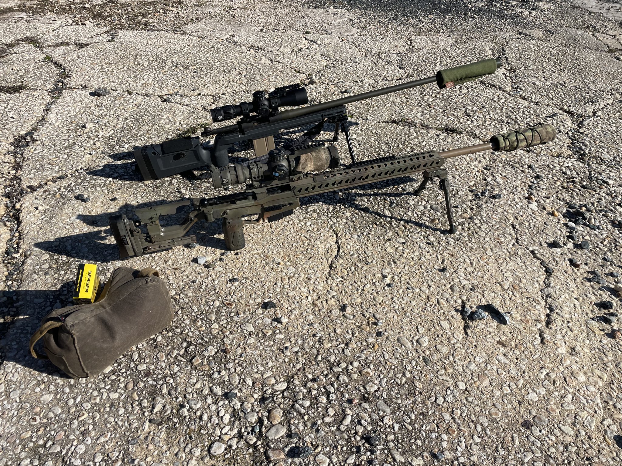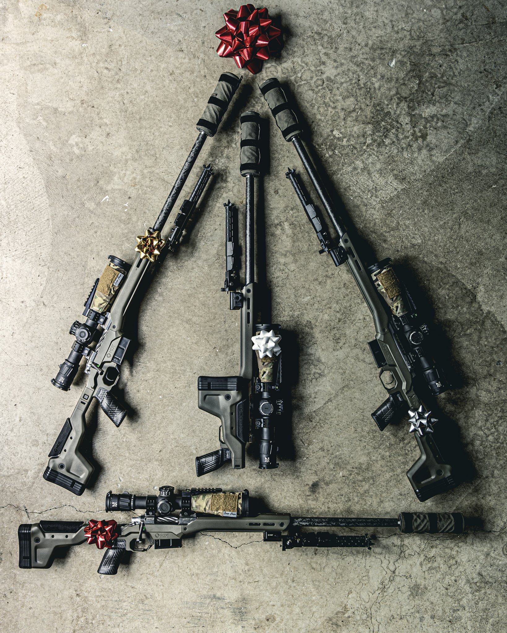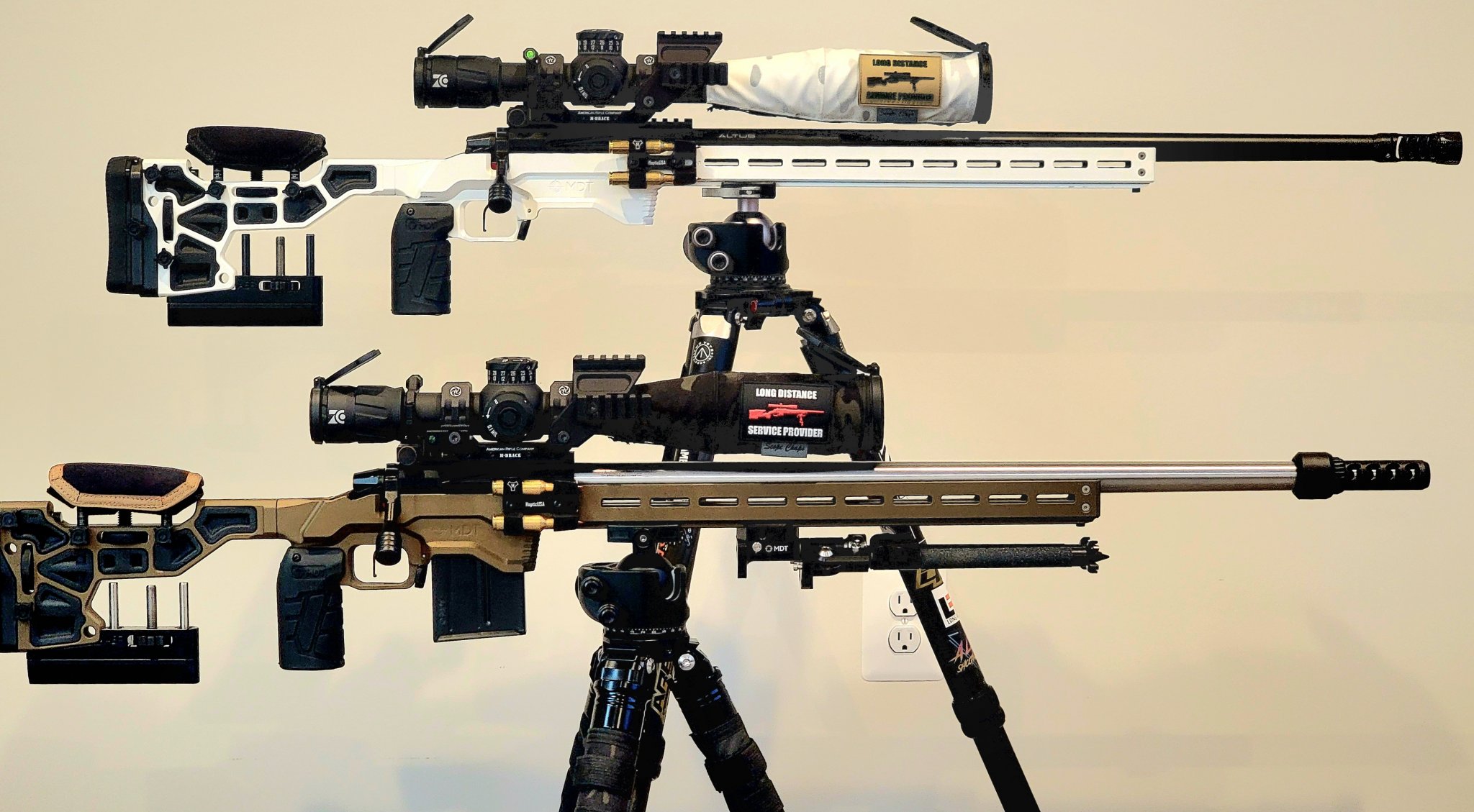 It's all one rifle, just a little photoshop fun. Defiance anTi X action with a 24" PROOF Research carbon fiber barrel chambered in 6.5 PRC, Trigger Tech Diamond 2-stage, MDT HNT26 in Cobalt Green, Hawkins Precision Tactical Rings, ZC527, MDT Double Pull Lightweight Ckye-Pod, Abel Co. Theorem Suppressor, FHF Gear suppressor cover, and Scope Chaps riflescope objective cover.