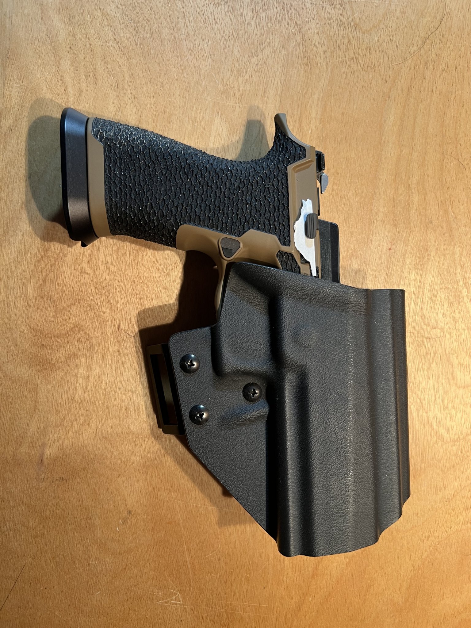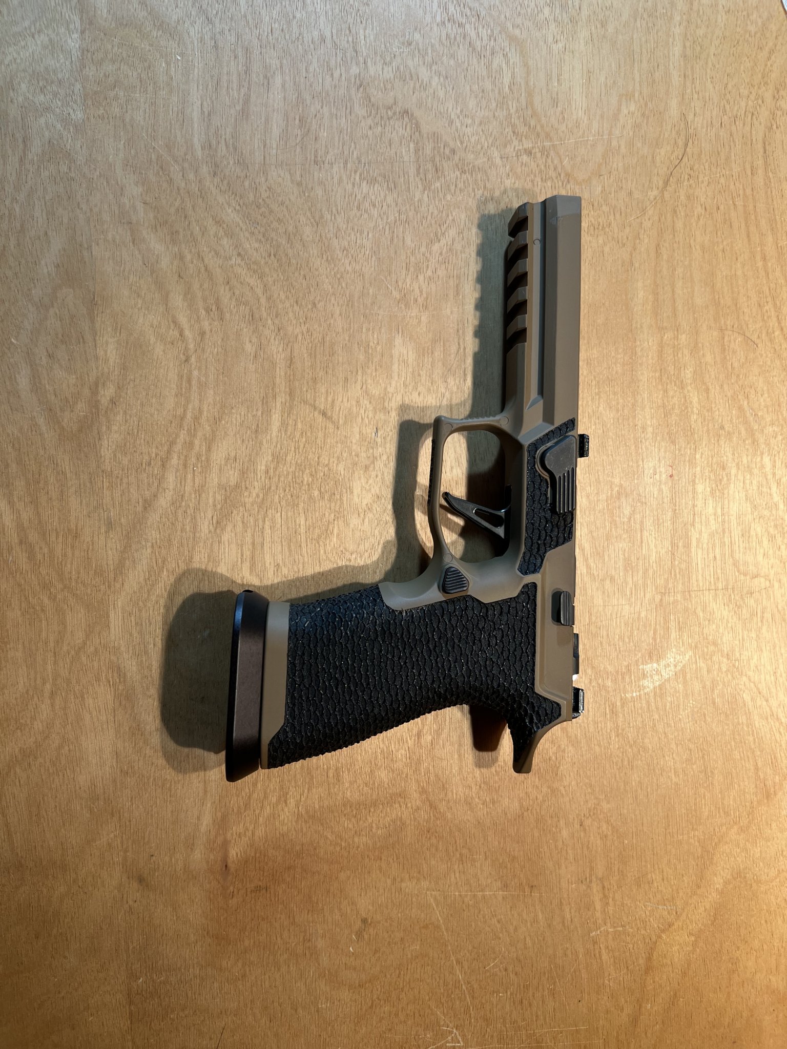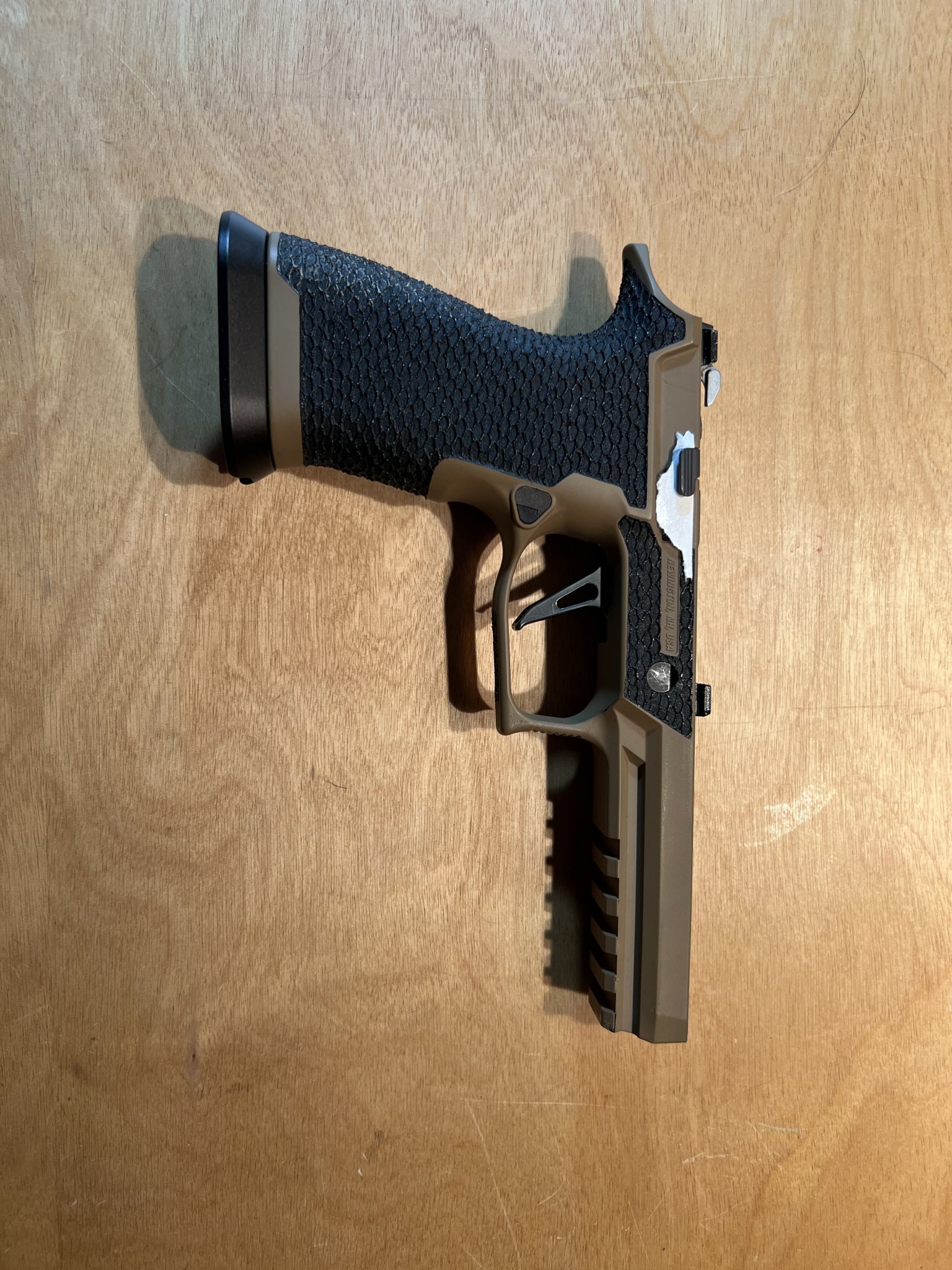 P320 custom works trigger group with sig armor trigger upgrades in a TC custom Xfull grip module (Barrett brown/ black) and Armory Craft magwell. Throwing in a T. rex arms iron side. 600 shipped.