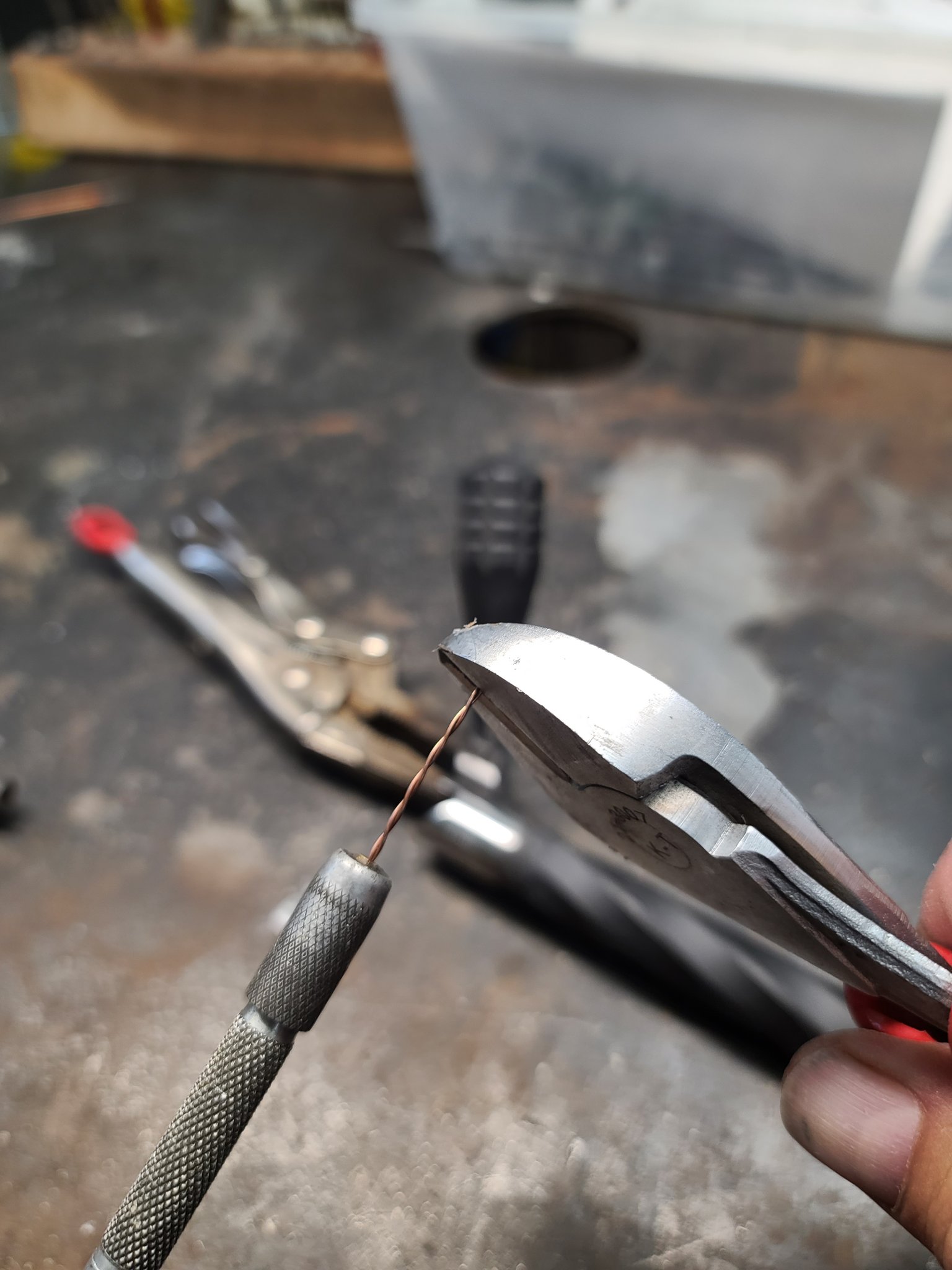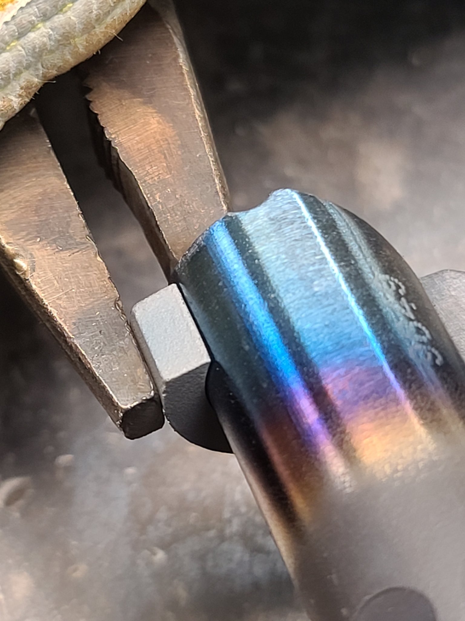 A 2x diopter helps my 52 year old eyeballs with the finer welding stuff. I use a pin vise to hang onto the wire. The stitch weld on the strap is only around .025 to .03 wide.