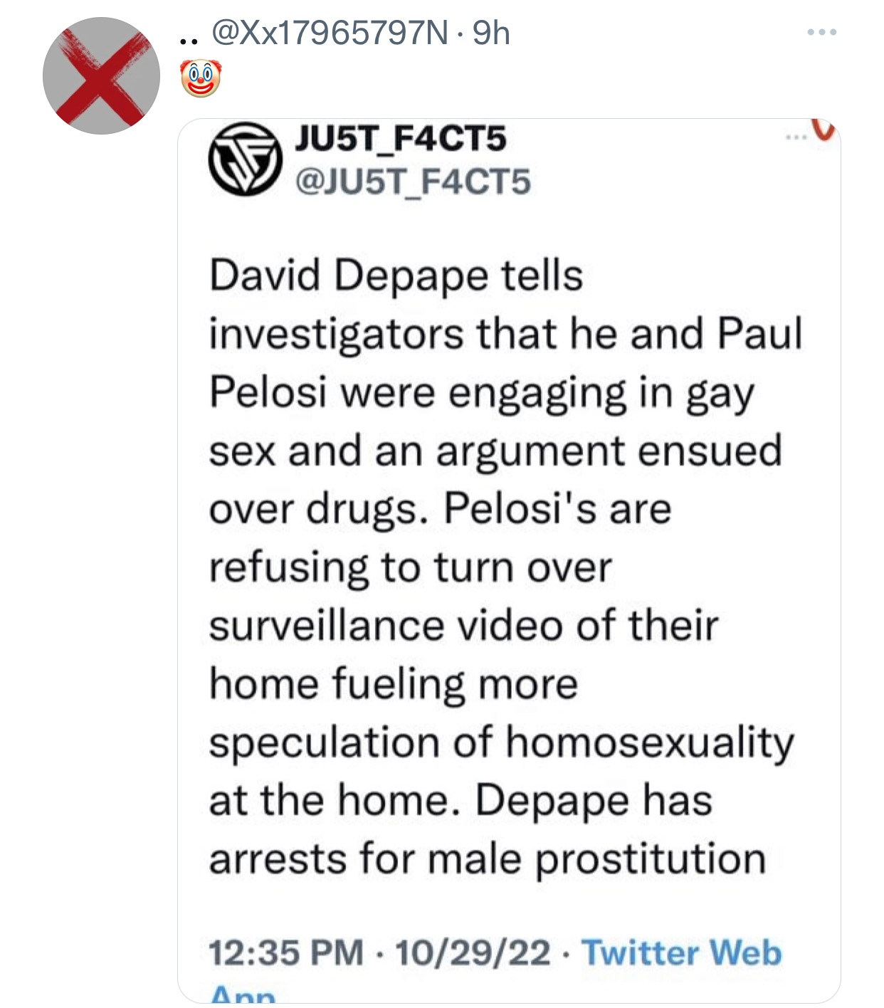 Sources? Proof? Where did Depape tell investigators he was engaging in gay sex with Paul Palosi? Where? Looks like some rando on Twitter is just making that up. Is there a published statement from Depape or from FBI or SFPD?
