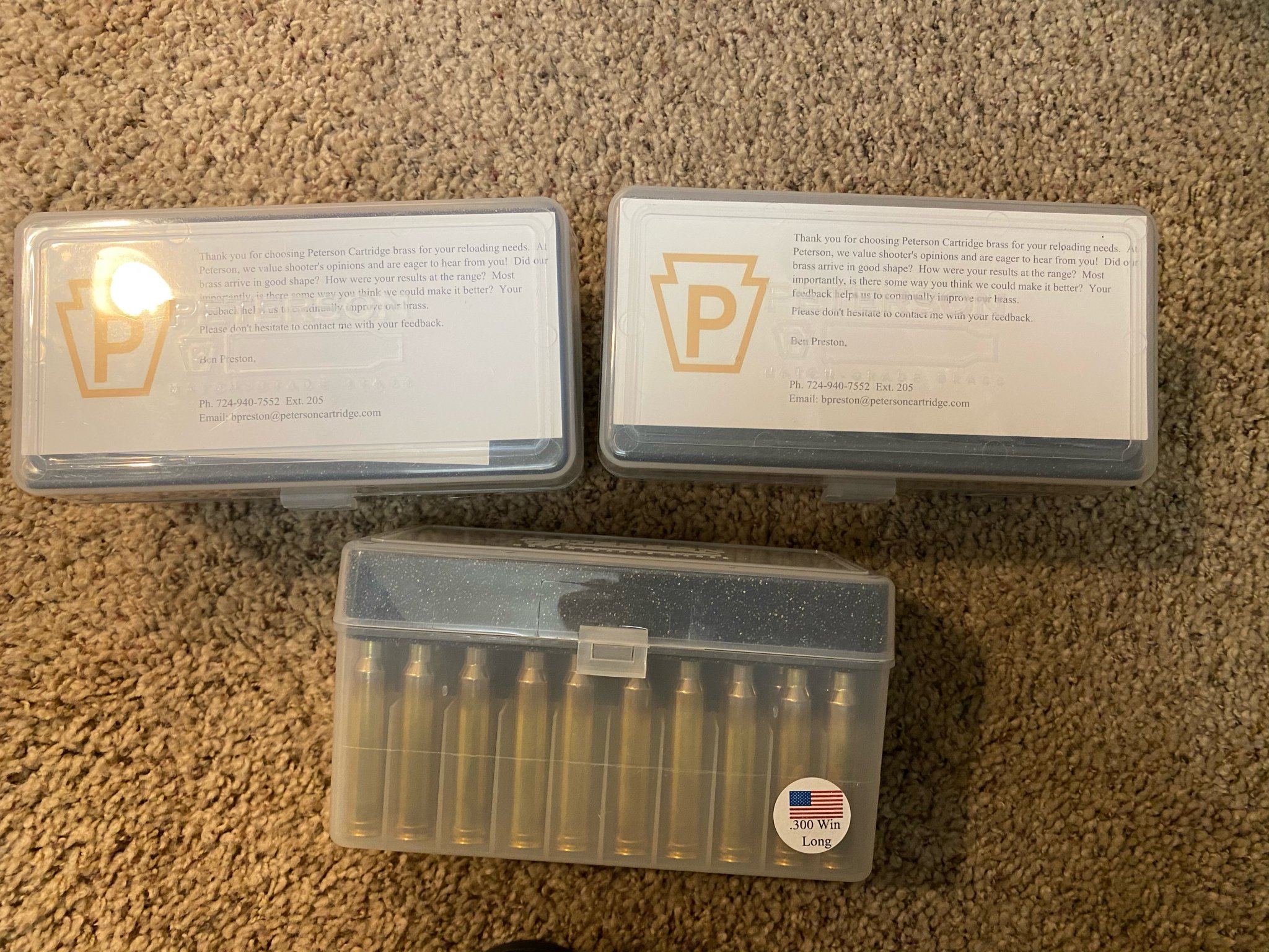 Selling 3 unopened boxes of Peterson 300 Win Mag (Long) Brass (150 total). This is the newly released version. I am selling it because I found some more ADG and do not want to have to redo load work up. Asking what I paid - $225 TYD.