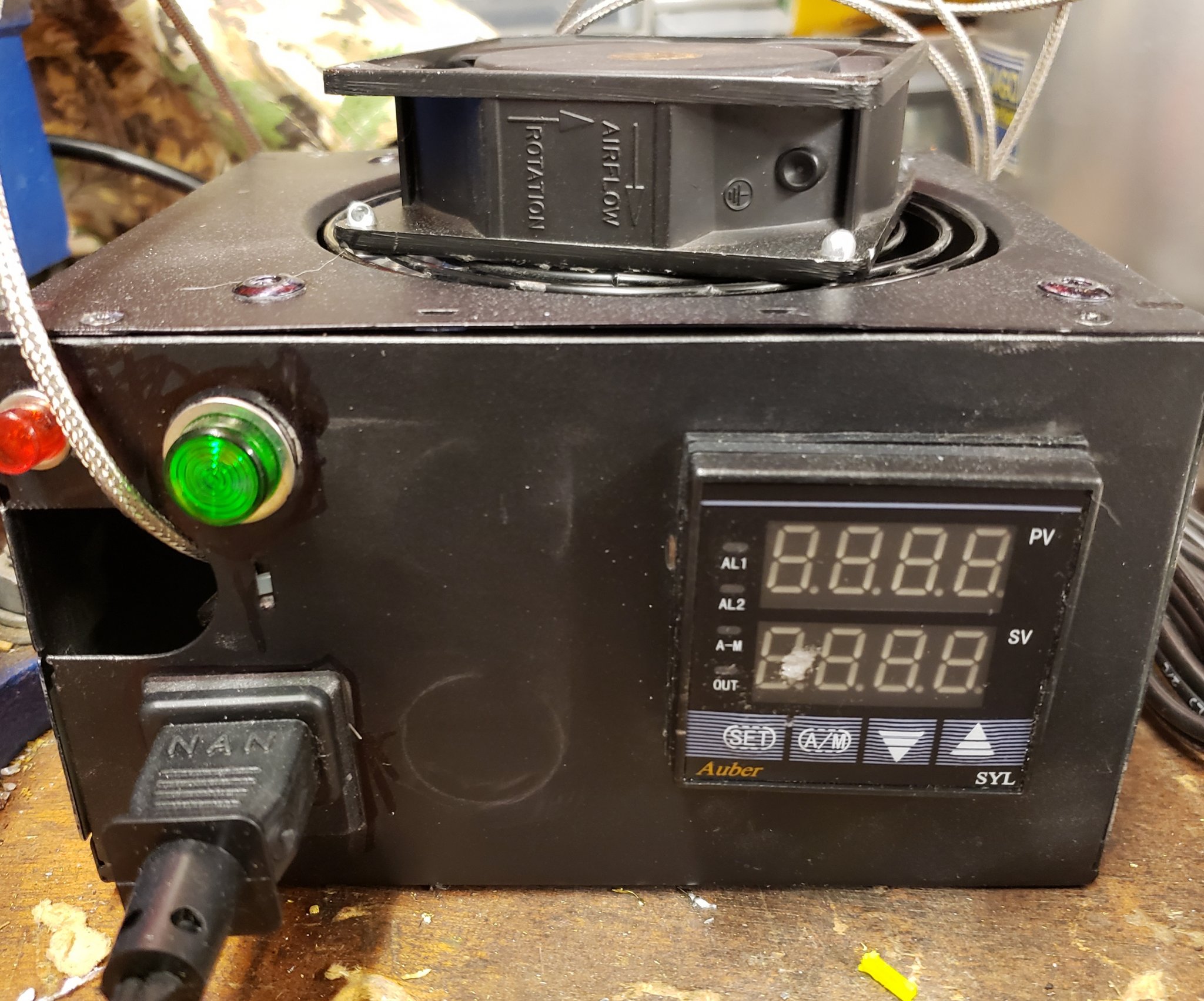 I used a 500w computer power supply (stripped) that already had a male power socket and a power switch. If you use a different enclosure, you will need a power switch and male power socket. I used 14-18 gauge wire to wire everything and I also used wire connectors that I had already. At a later time, I can include a wiring schematic but I'll have to create that because I modified my last PID build. I have the 100V fan wired directly to the Solid State Relay (SSR) so that the fan only comes on when the SSR is running. It is not hard to build the PID...even a caveman can do it!